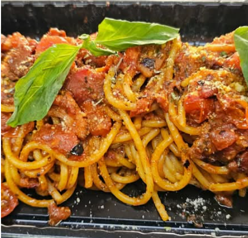 Delicado spaghetti, acompañado de crujiente tocino, tomates cherry jugosos y aromáticas de especias italianas, todo en una suave salsa de la casa con pesto rojo, finalizada con parmesano rallado y albahaca fresca, una explosión de sabores en cada bocado.