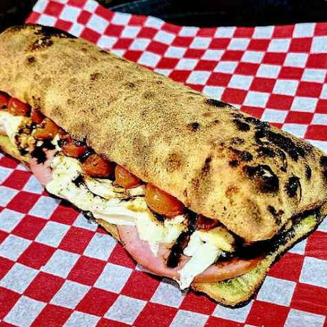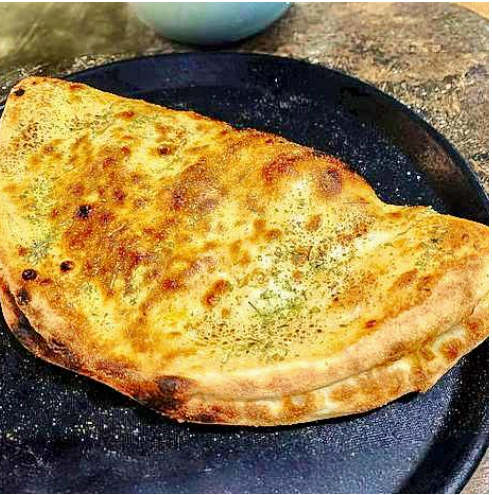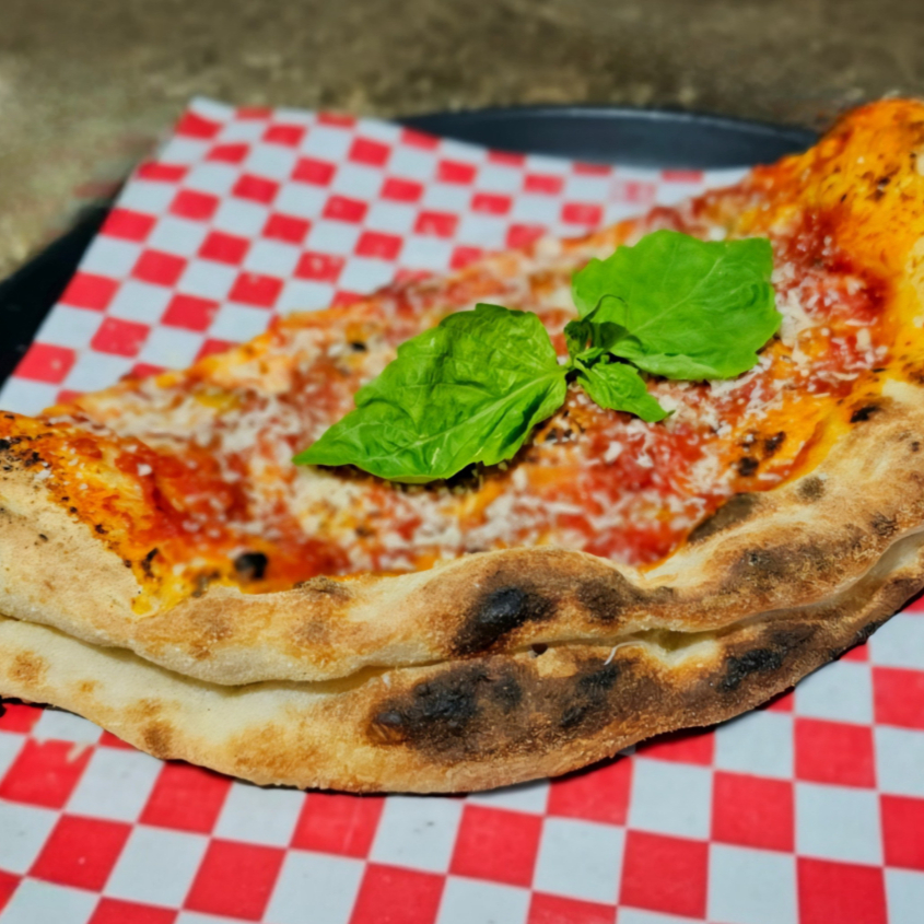 Deliciosa masa horneada a la perfección, rellena de sabores suaves de jamón ahumado, queso de cabra, queso mozzarella, aceitunas, albahaca fresca y terminado con un toque de pomodoro y queso parmesano.