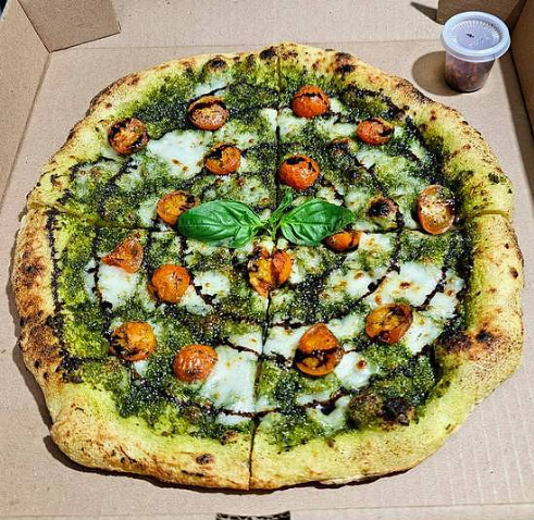 La auténtica ensalada italiana convertida en pizza, base de pesto verde, acompañada de queso mozzarella, albahaca fresca, tomates cherrys salteados y terminada con reducción de aceite balsámico, tamaño de las pizzas de 28 a 30 cm aproximadamente.