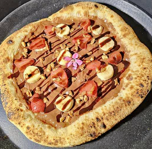 Para los amantes de lo dulce, pizza con base de nutella, acompañada de fresas, plátano y nuez coronada con salsa de chocolate, tamaño de las pizzas de 28 a 30 cm aproximadamente.