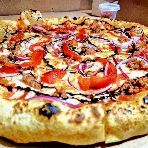 Una combinación inigualable, salsa pomodoro y queso mozzarella, acompañada de salchicha italiana, pimienta roja, cebolla morada, queso provolone y reducción de aceite balsámico, la quieres con pesto o con tomate, tamaño de las pizzas de 28 a 30 cm aproximadamente.