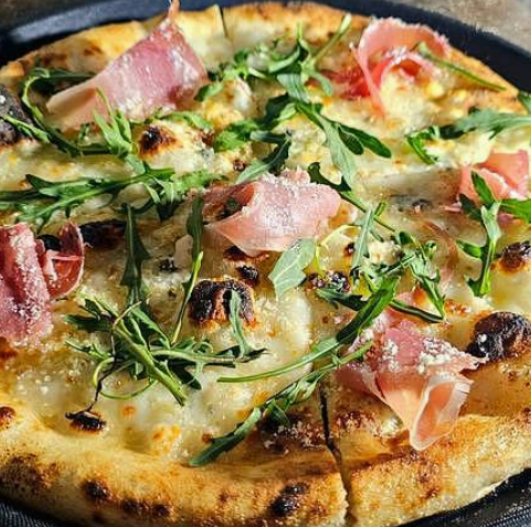 Base de 4 quesos italianos, acompañado de prosciutto, arugula y especias italianas la cual acompañan a la perfección el sabor de los quesos.