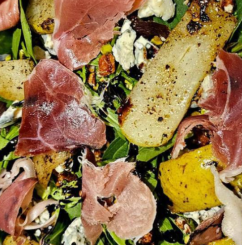 Mx de ensaladas, acompañada de nuez caramelizada, pistache, reducción balsámica, queso azul, pera asada, prochutto y su vinagreta.