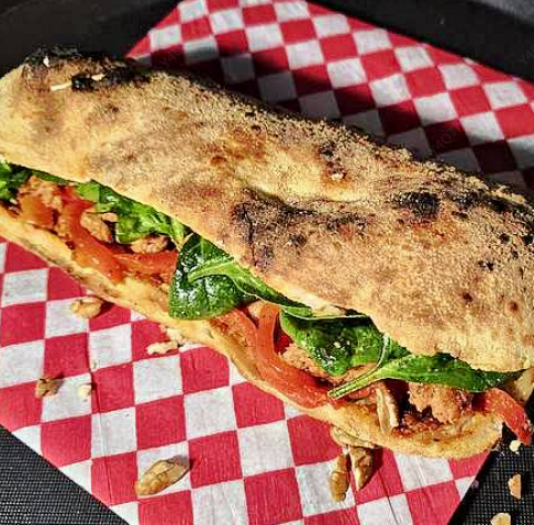Crujiente por fuera, rojo por dentro, delicioso pan abierto a la mitad, acompañado de una base de pesto rosso y jocoque con ajo, salchicha italiana, espinaca salteada y tomate deshidratado.