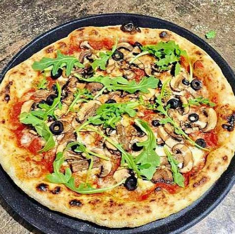 De mis favoritas sin duda, tiene un sabor inigualable, salsa pomodoro, queso mozzarella, champiñones baby bella, tomate deshidratado, aceitunas y arúgula, tamaño de las pizzas de 28 a 30 cm aproximadamente.