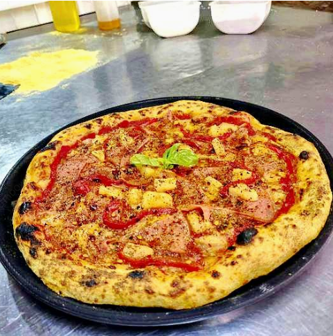 Para los que no se conforman si no hay piña, salsa pomodoro, queso mozzarella, jamón ahumado, pimiento rojo rostizado, piña y especias picantes italianas, tamaño de las pizzas de 28 a 30 cm aproximadamente.