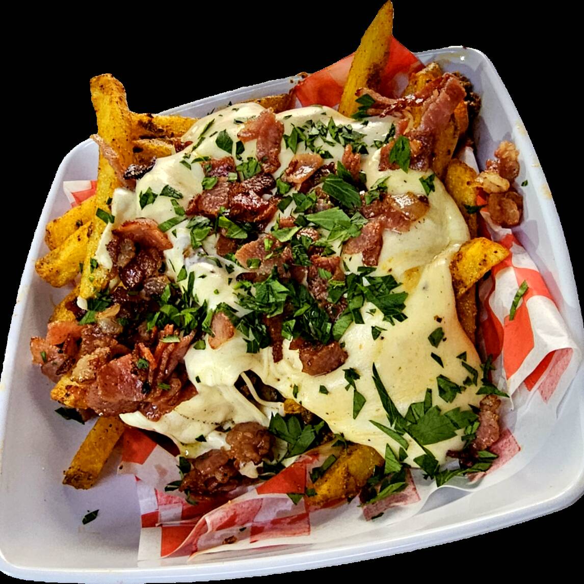 Irresisitibles papas doradas acompañadas de nuestra cremosa salsa matcha y el intenso sabor del pesto rojo. coronadas con queso fundido y crujiente tocino, una combinacion unica que fusiona lon gurmet con lo irresistible
