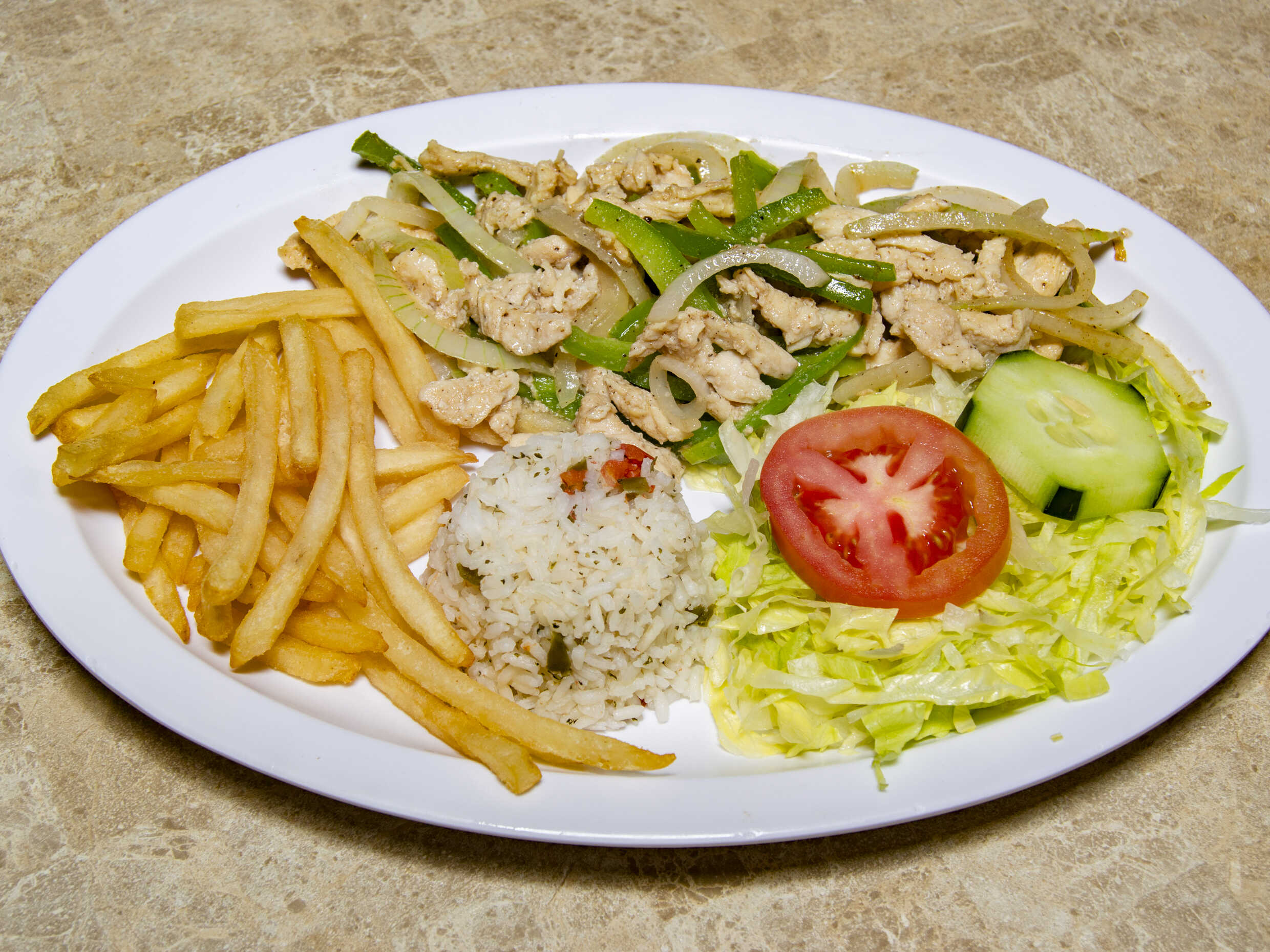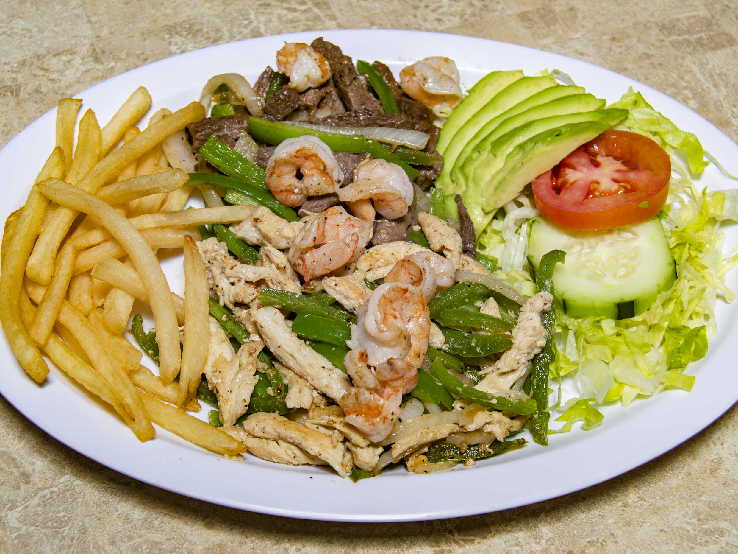 Fajitas de pollo, arrchera y camarón, salteadas con pimineto morrón y cebolla; acompañadas de ensalada verde, papas y aguacate