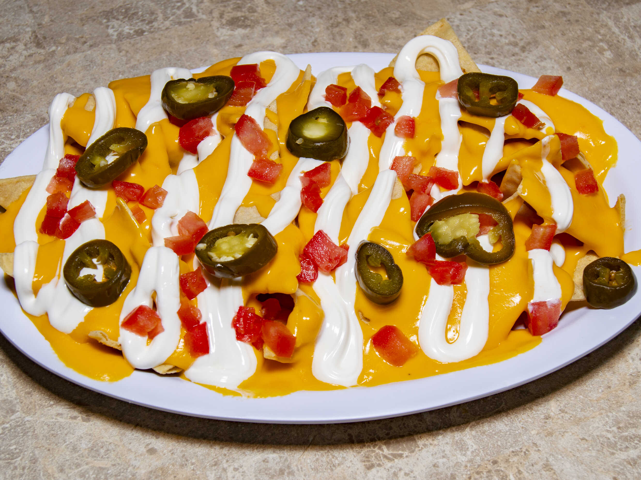 Crujientes totopos bañados queso amarillo, con trocitos de tomate y la tradicional crema menonita