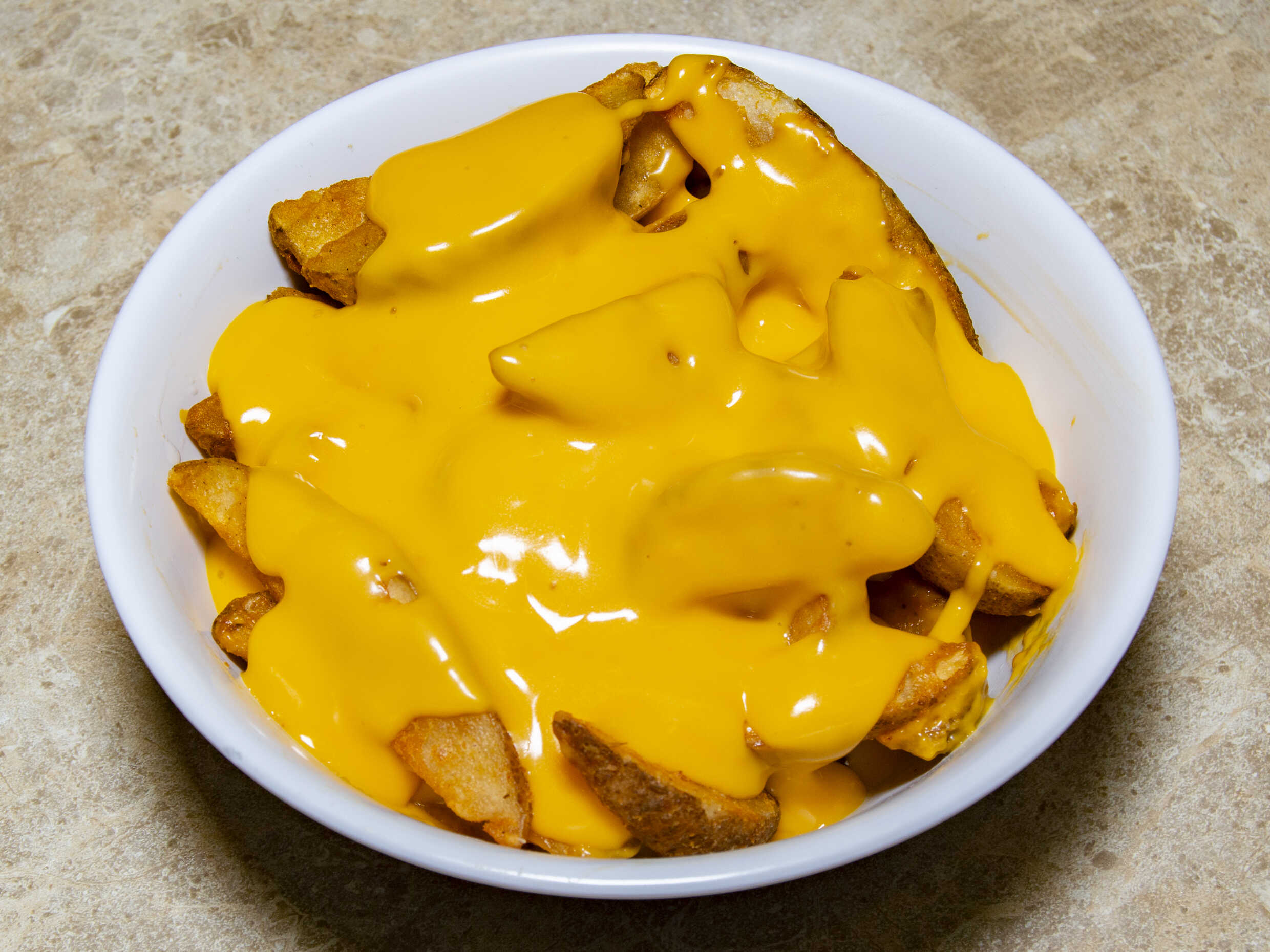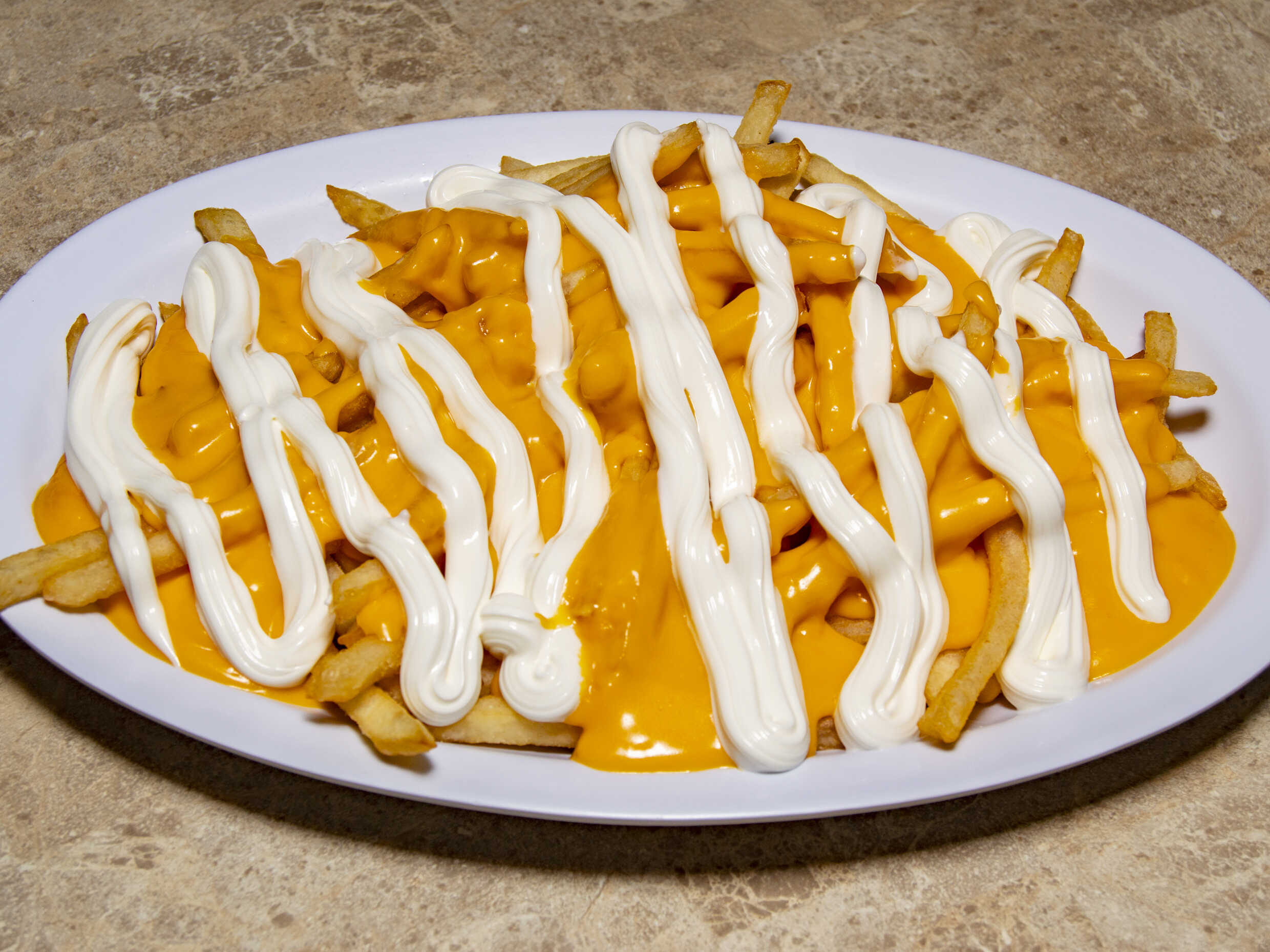 Deliciosas papas a la francesa bañadas con queso amarillo y crema