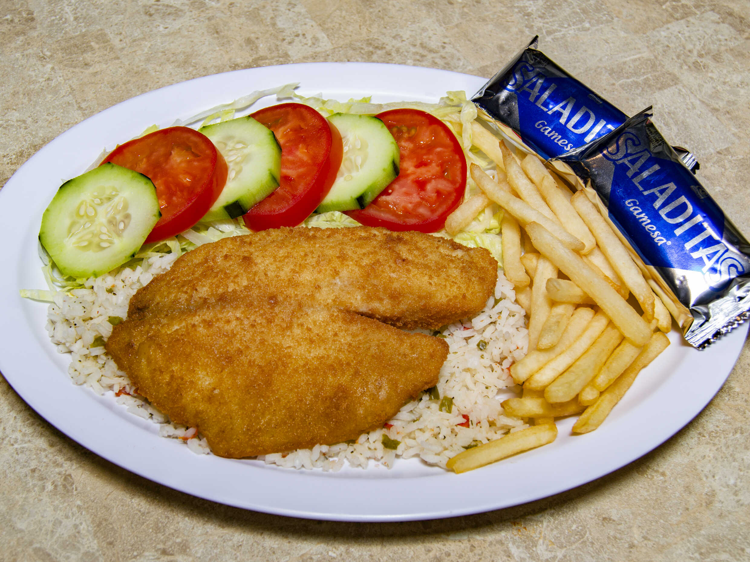 Filete de pescado empanizado, sobre una cama de arroz; acompañado de endalada verde y papas