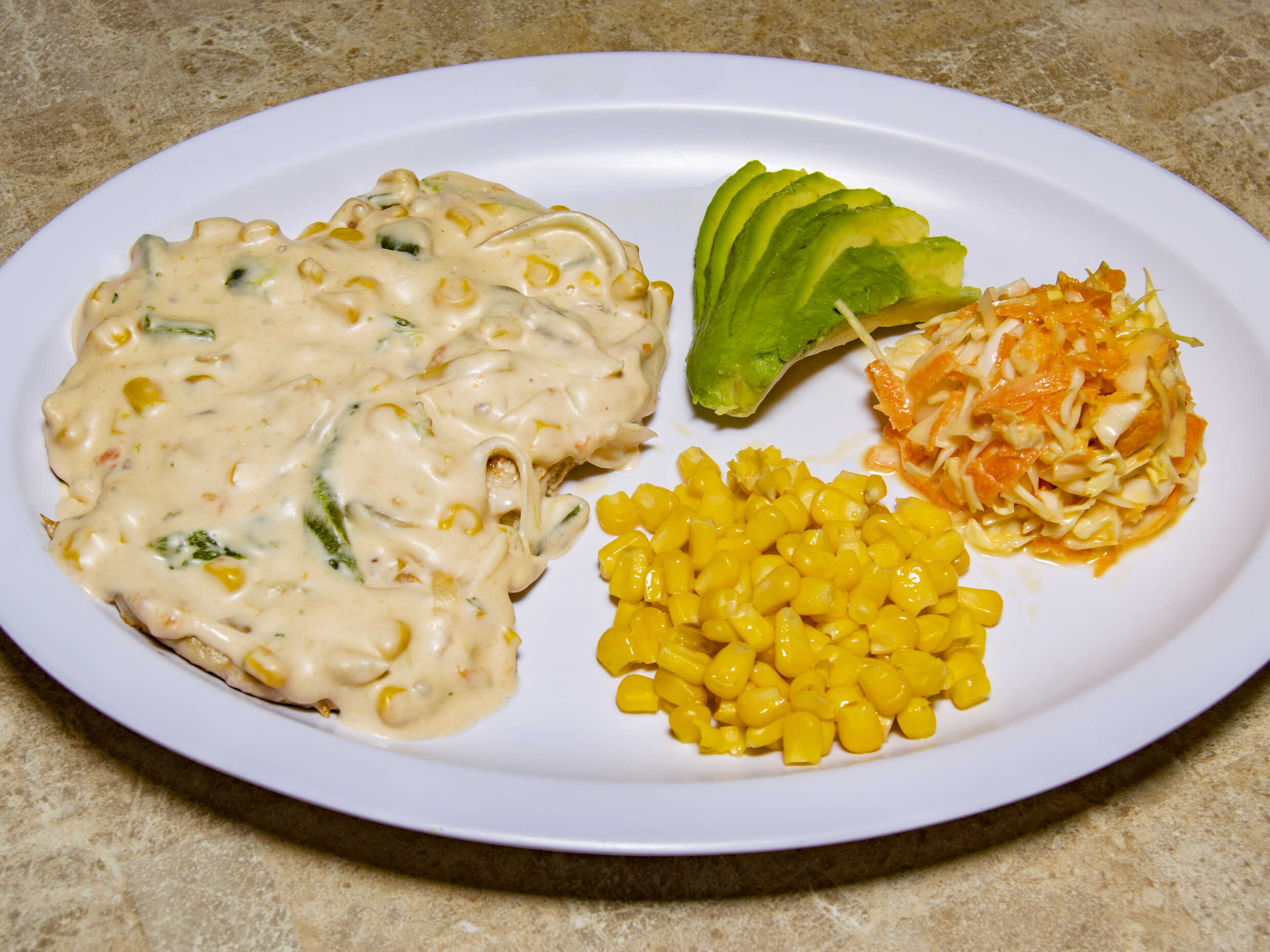 A la plancha y bañada en crema con rajas, acompañada de granos de elote, aguacate y ensalada de col154