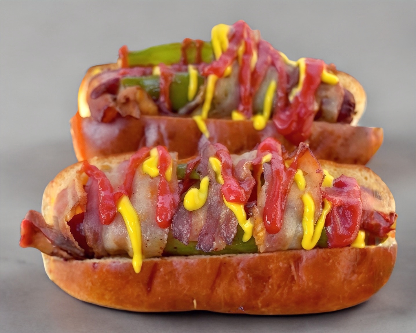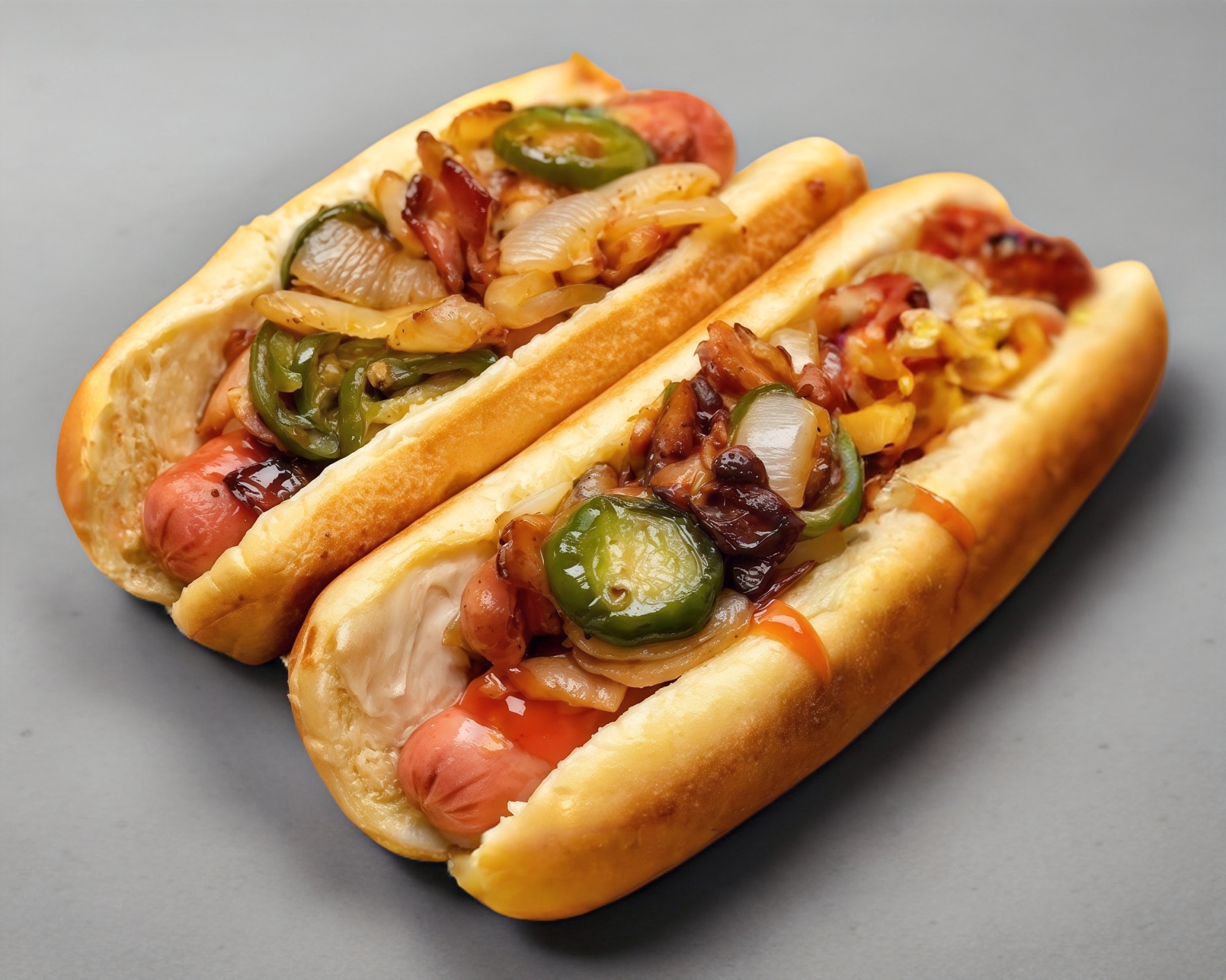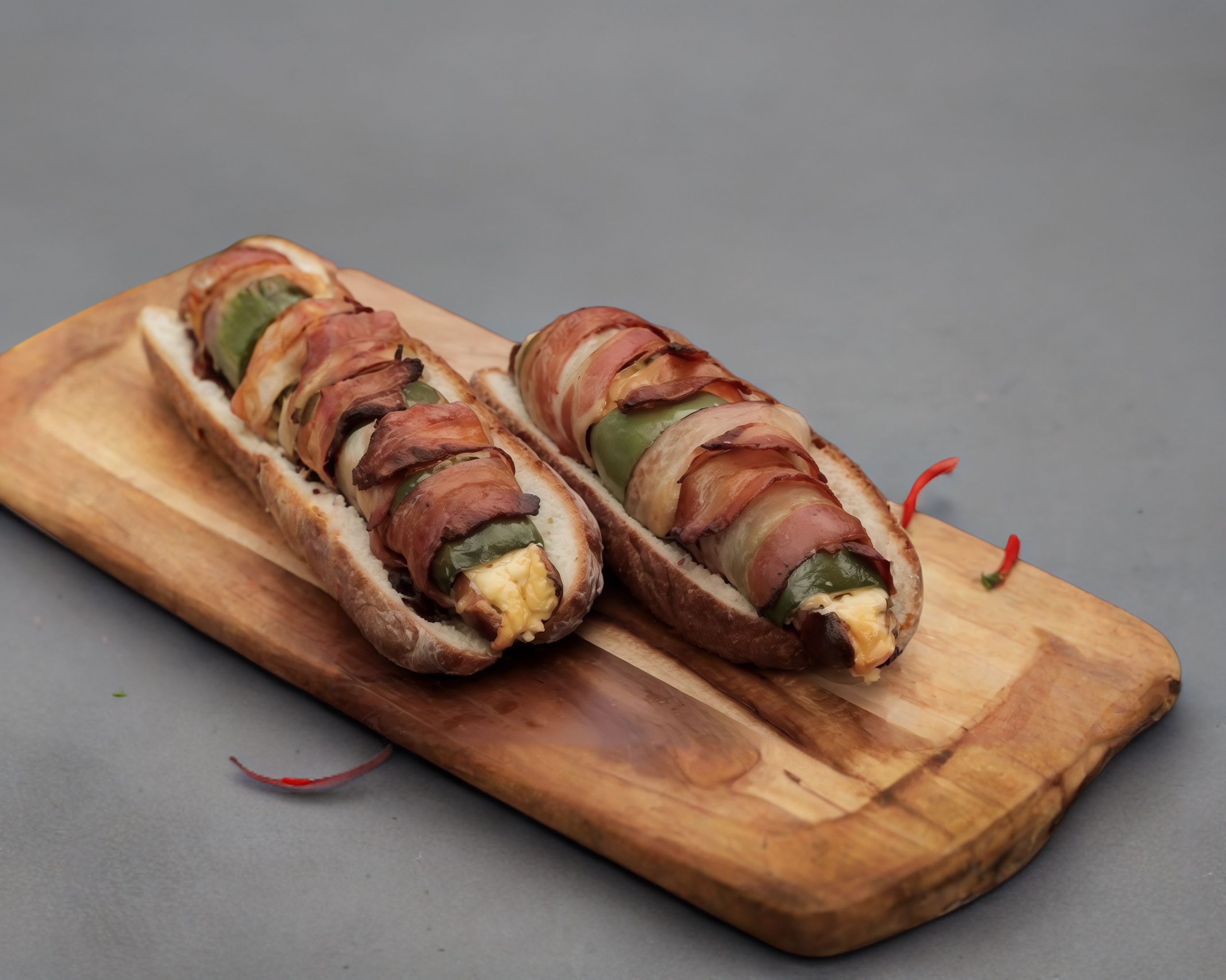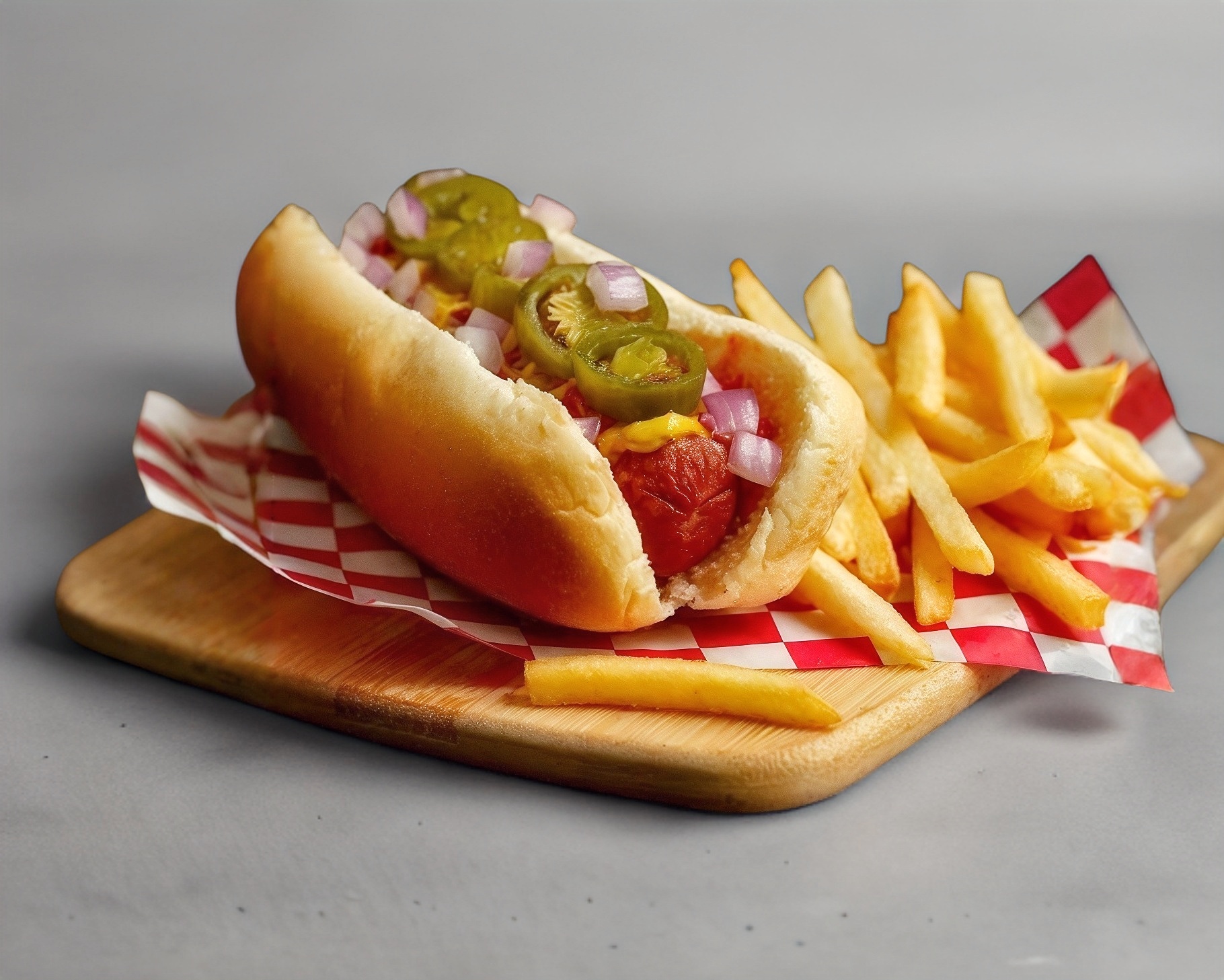 Pan, Salchicha de Pavo, Tocino, Chiles Poppers, Cebolla Caramelizada y una porción de papas a la francesa