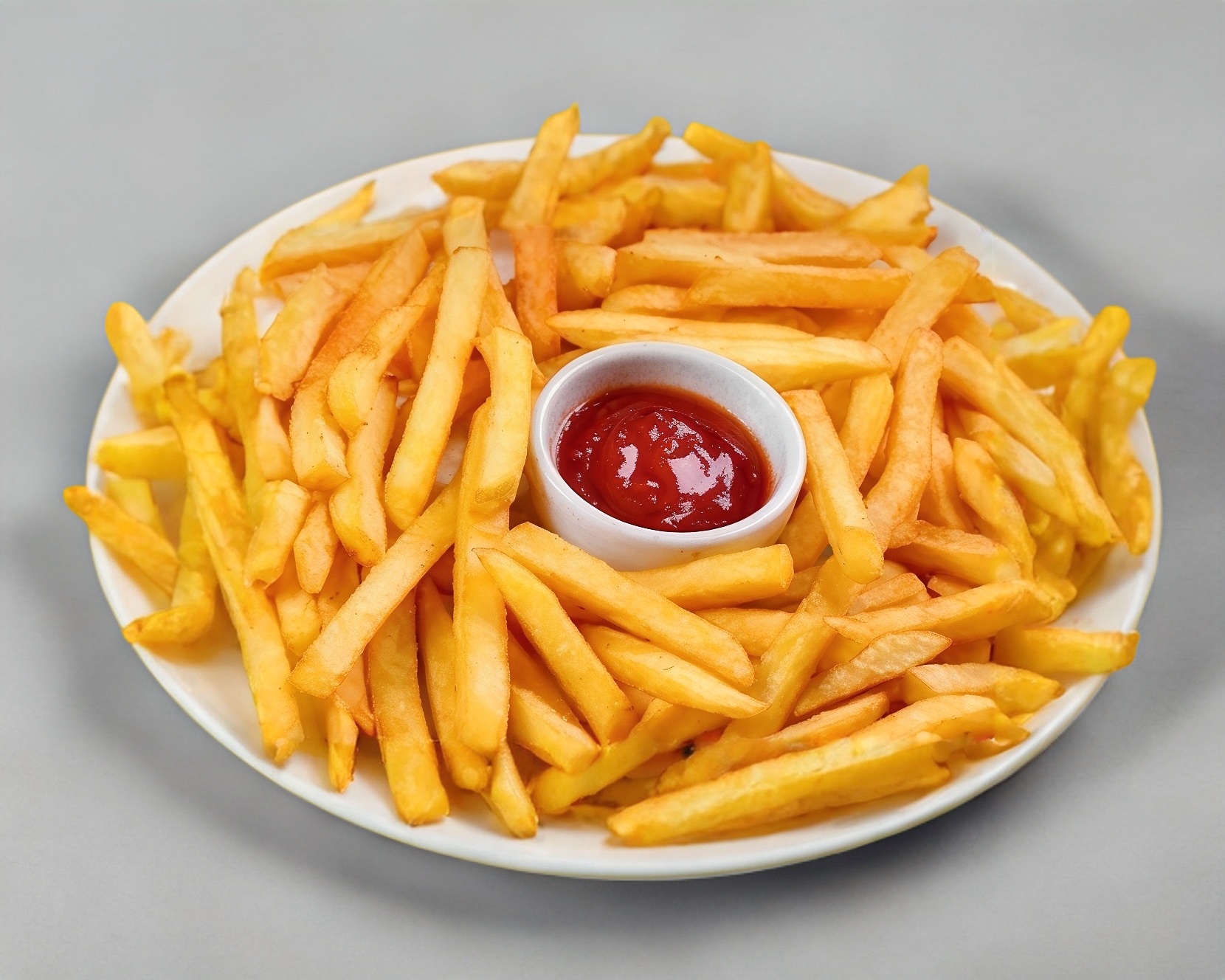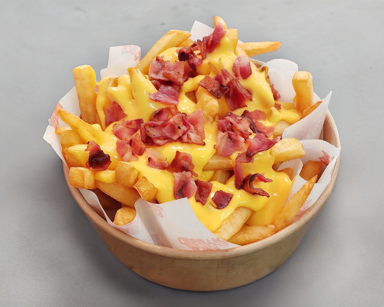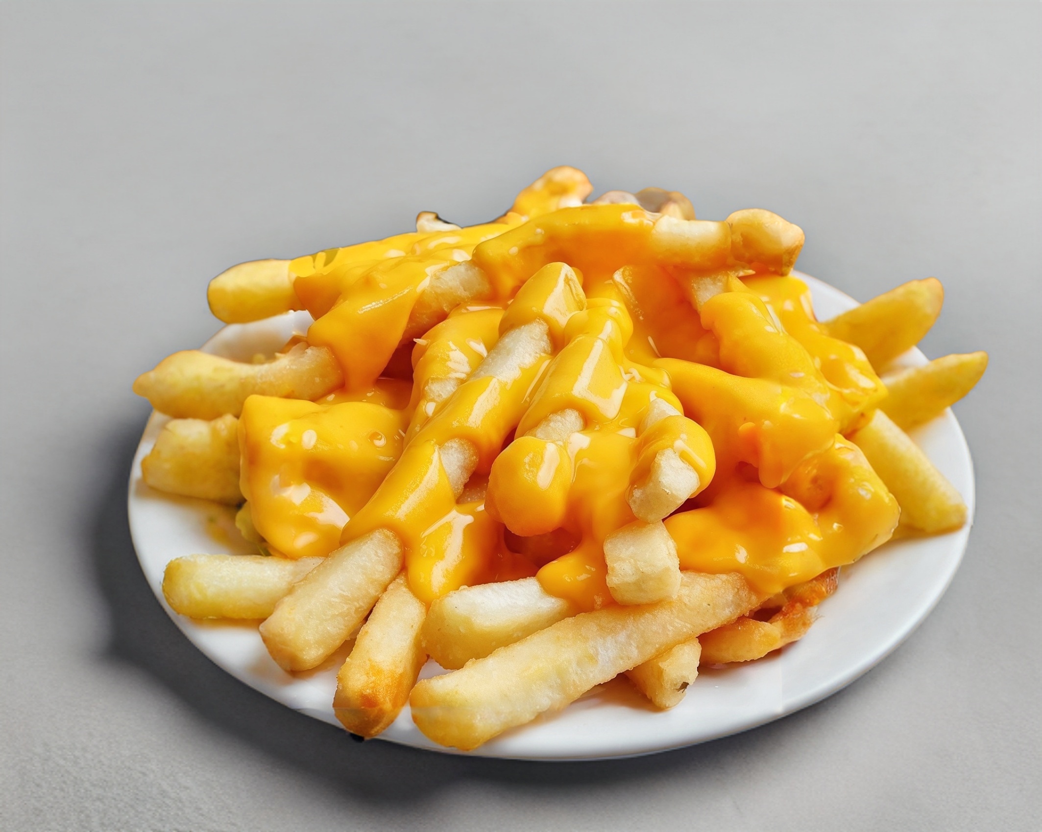 Papas a la francesa con queso amarillo y un complemento a elegir.