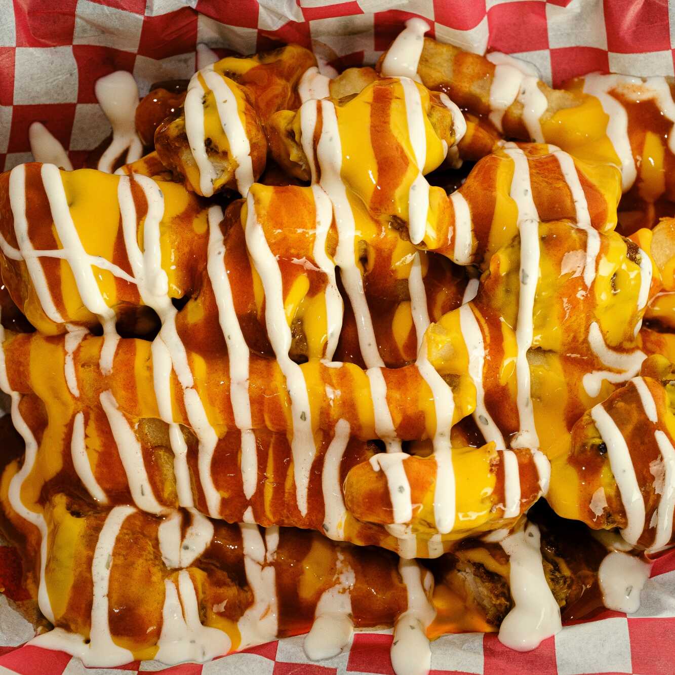250g de pollo crunch en una cama de papas onduladas bañadas con queso cheddar derretido, salsa buffalo y ranch