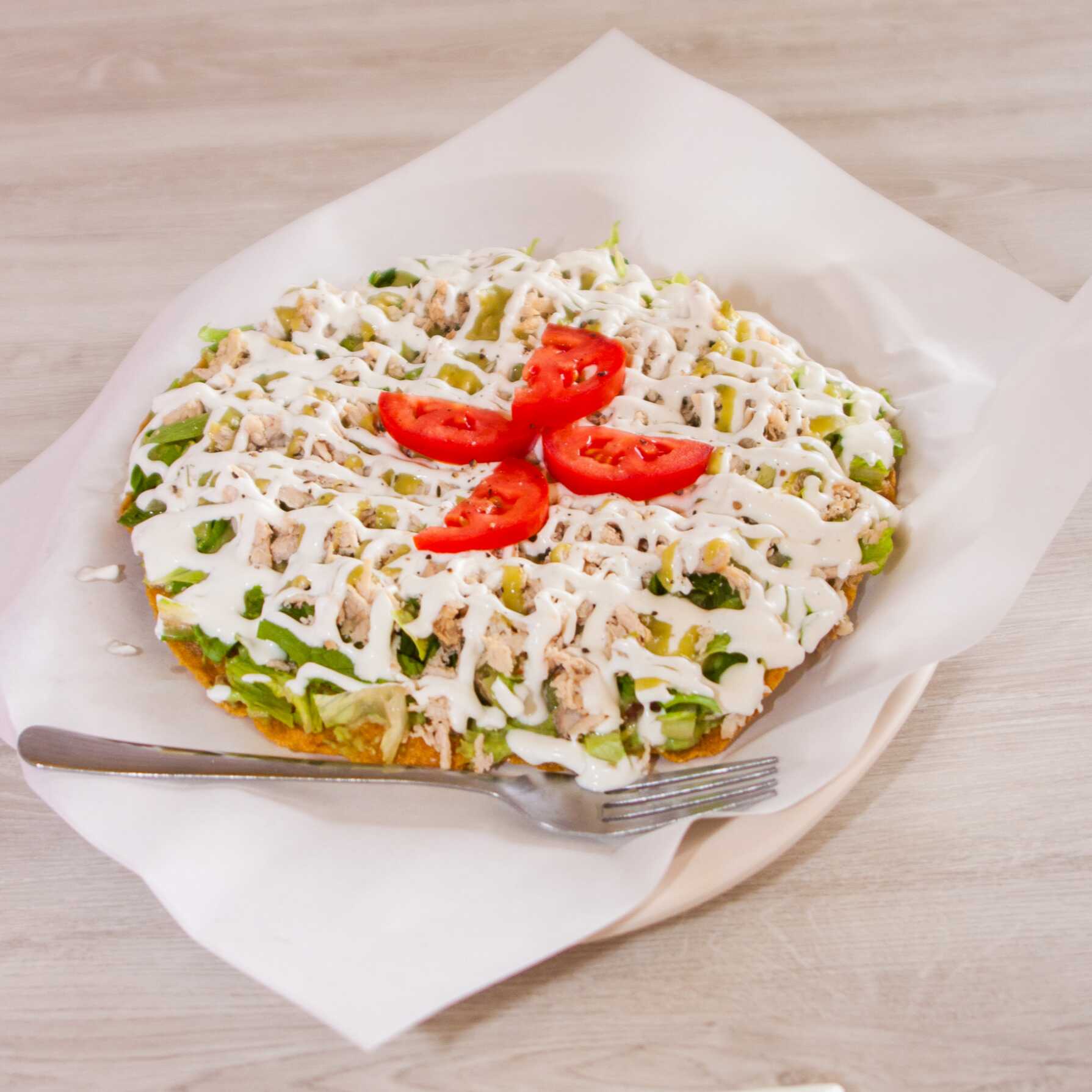 1 Pieza de Tostada de Pollo Gigante, pechuga de pollo desmenuzada, lechuga, tomate, salsa verde y crema