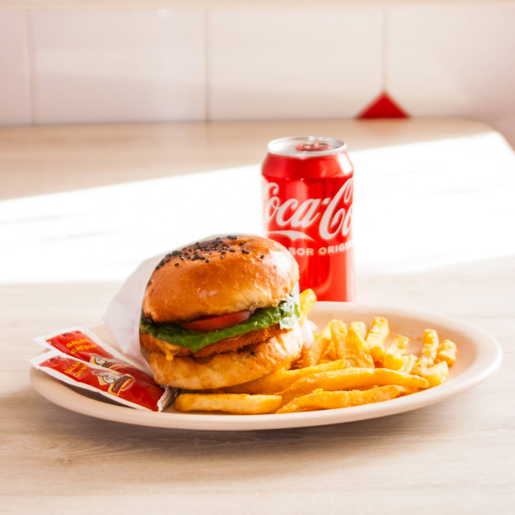 Hamburguesa de res o pollo, con media orden de papas a la francesa y refresco de 355 ml