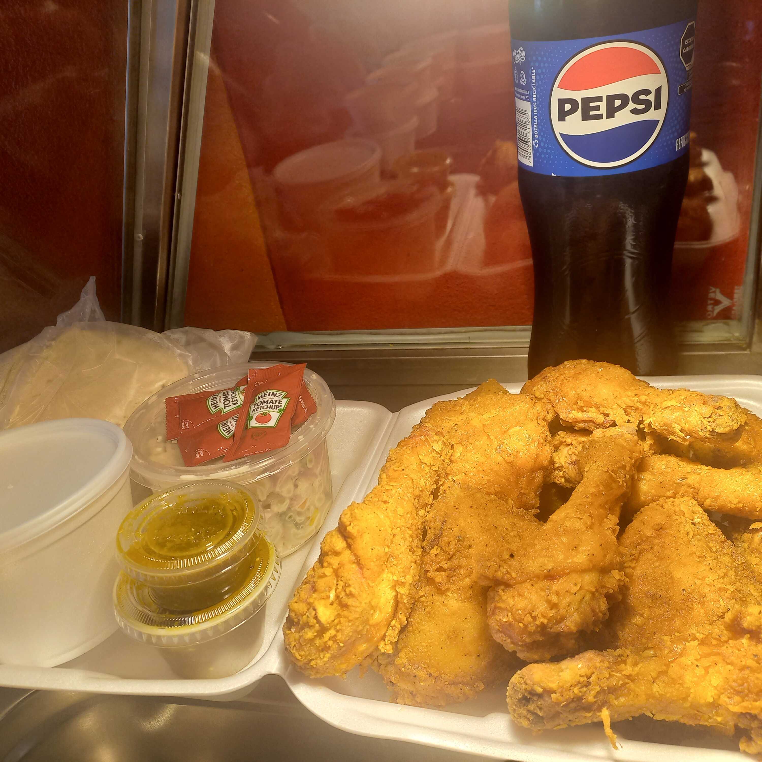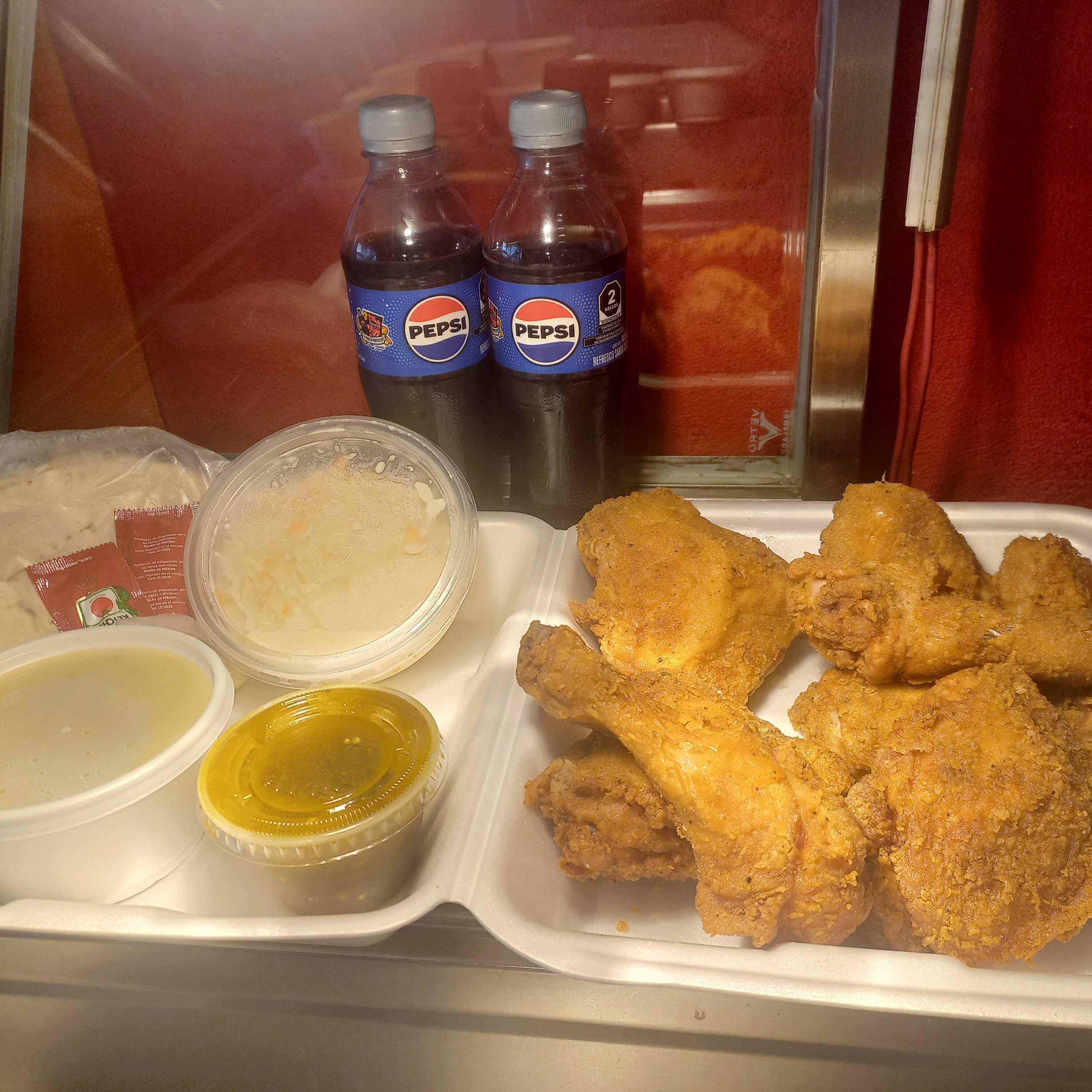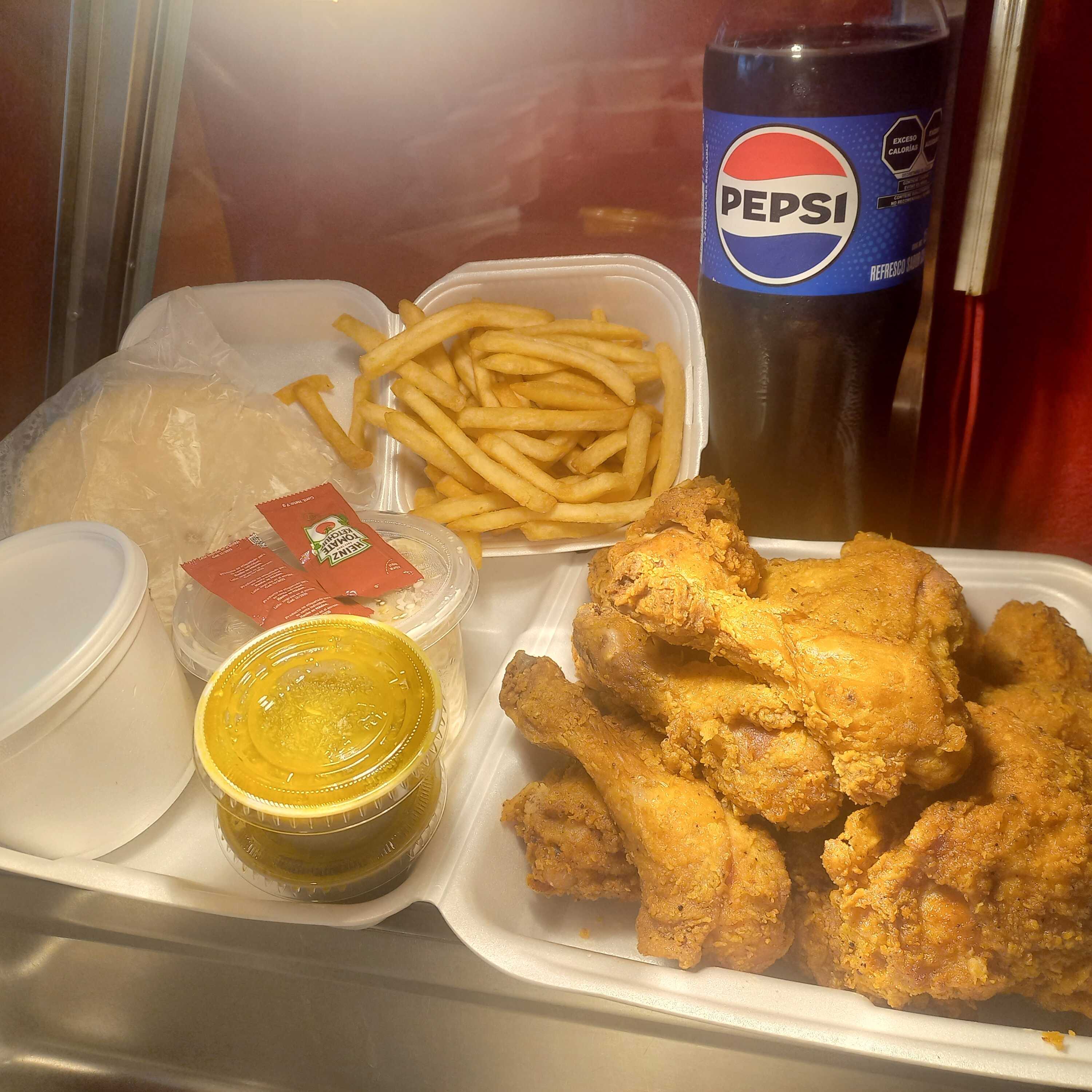 8 piezas de pollo, 1/4 de puré y 1/4 de ensalada, 2 refrescos de 400 ml (incluye tortillas y salsa)