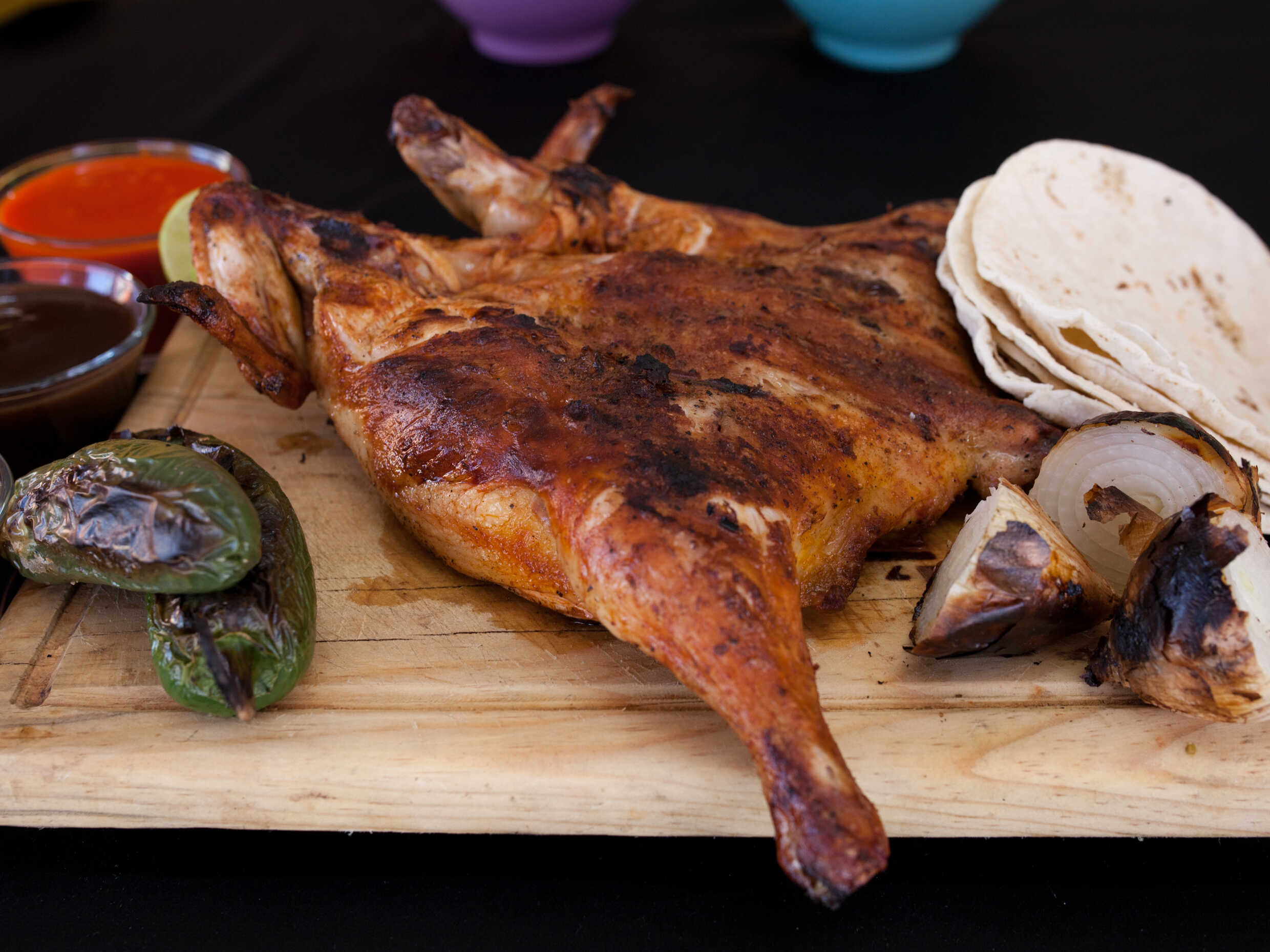 1 1/2 pollos, dos complementos a elegir + una salchicha asada, tortillas, salsas, cebollitas asadas, y limones.