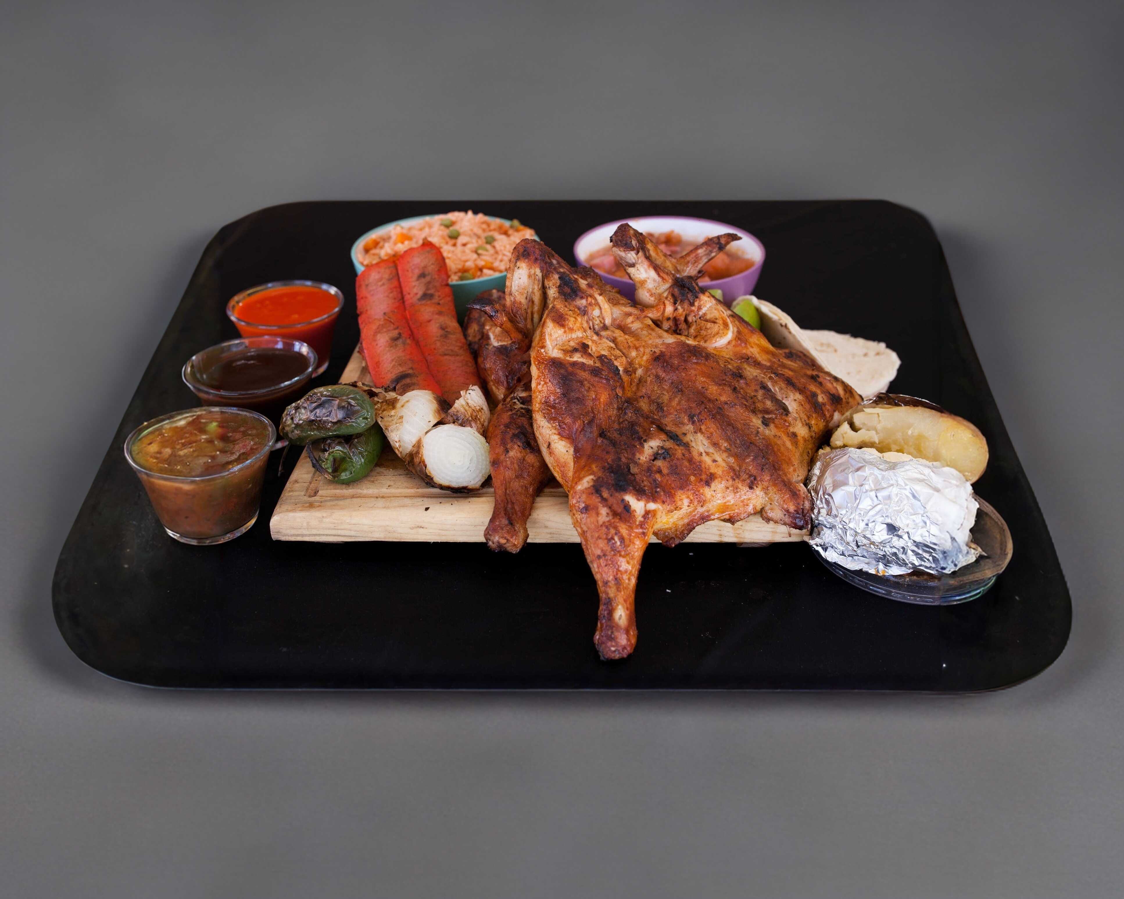 1 1/2 pollos, dos complementos a elegir + una salchicha asada, tortillas, salsas, cebollitas asadas, y limones.
