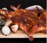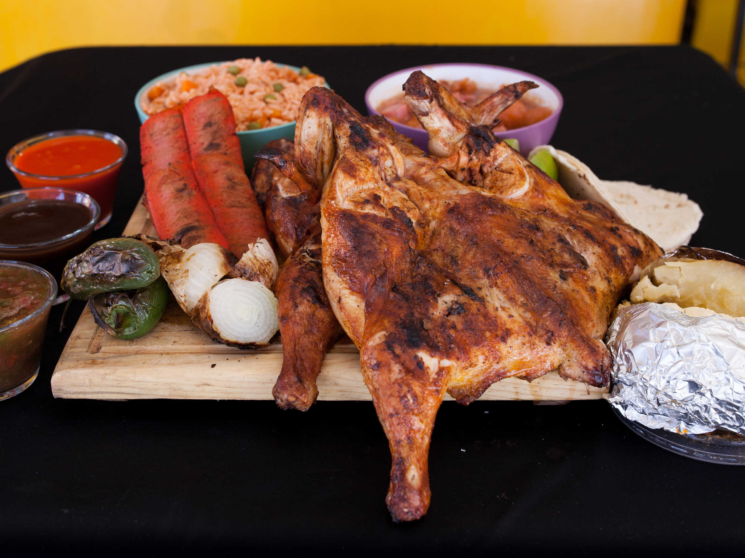 1 1/2 pollos, dos complementos a elegir, una salchicha asada, tortillas, salsas, cebollitas asadas y limones.