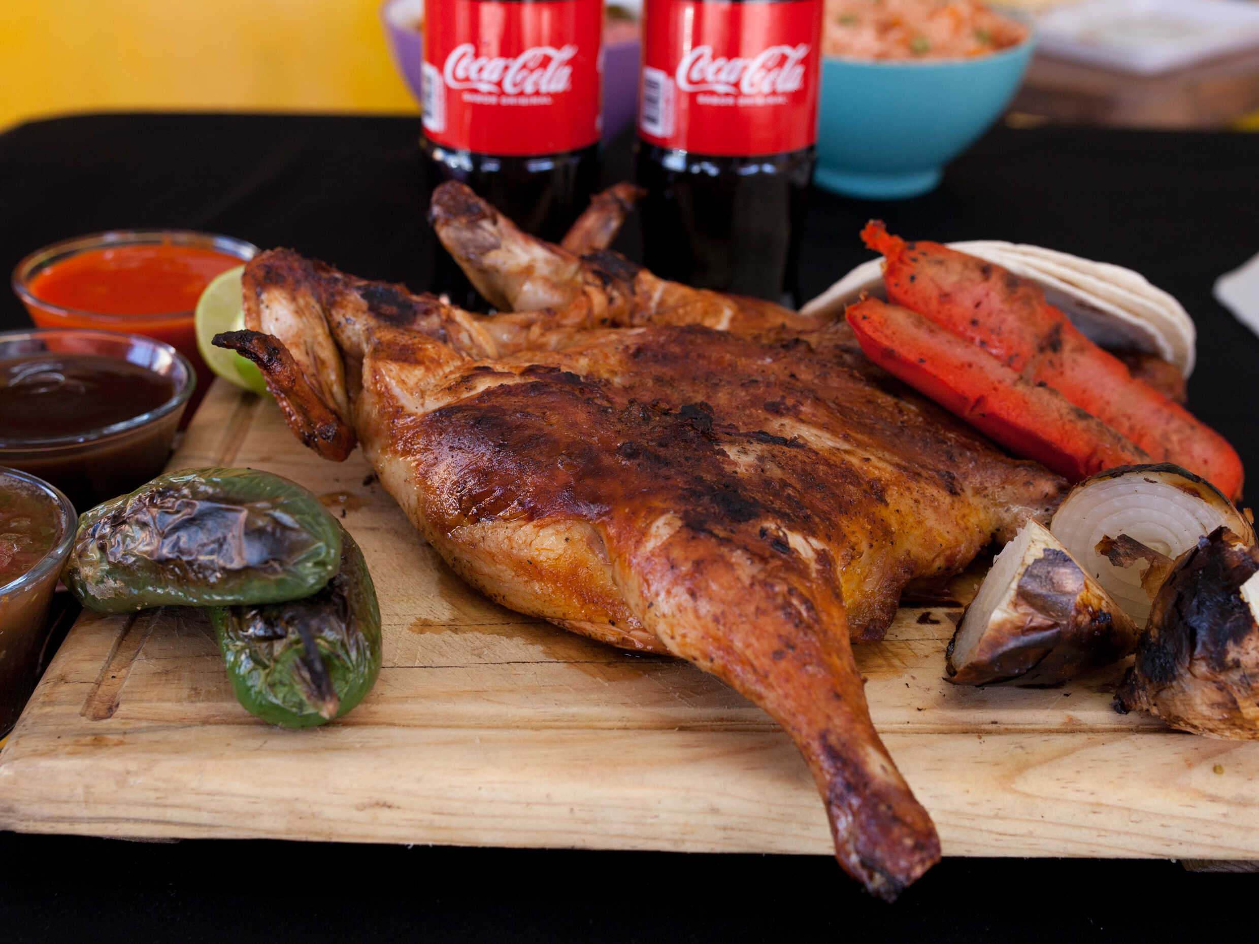 3 Pollos, refresco de 2 litros, tortillas, cebollitas asadas, salsas y limones.