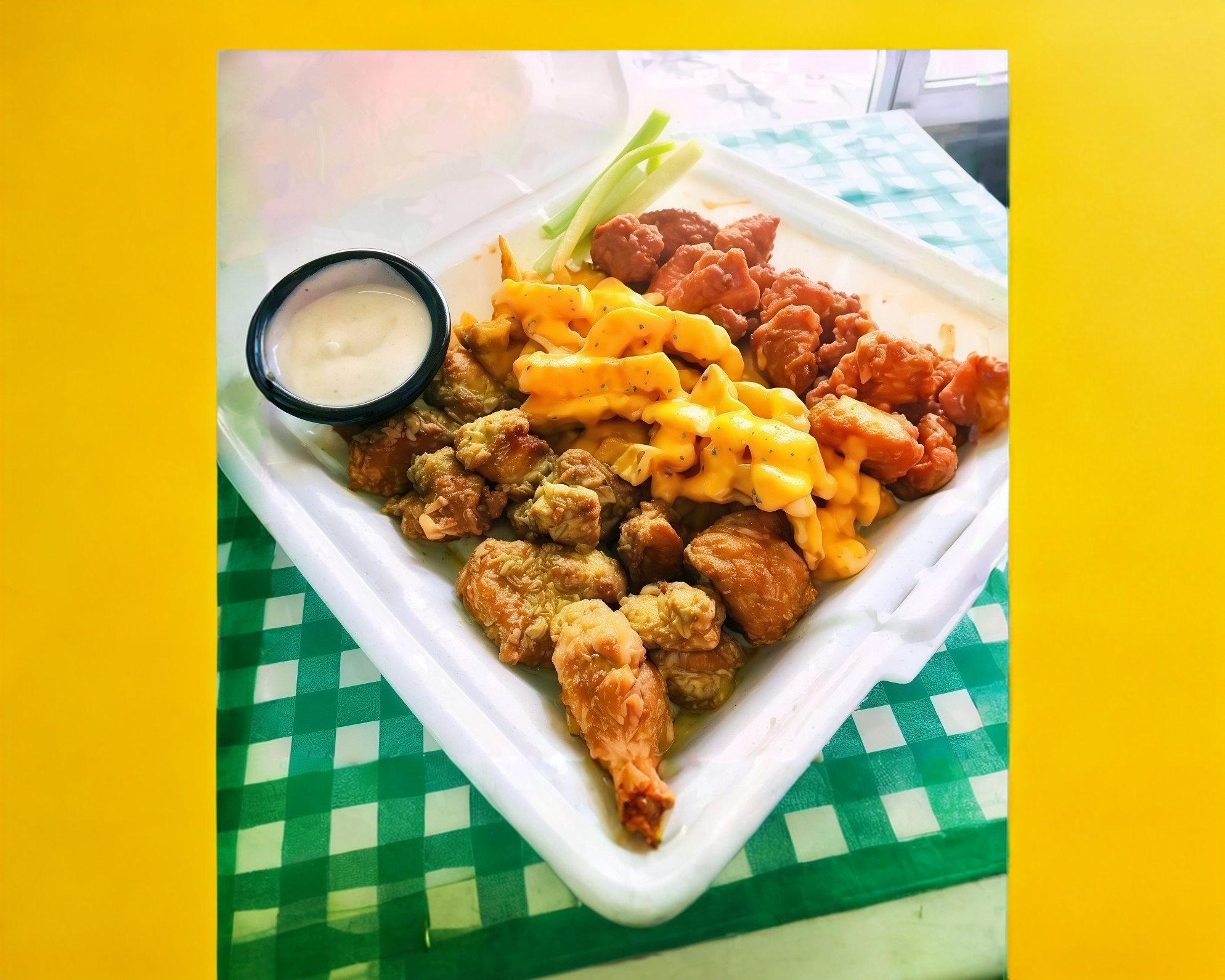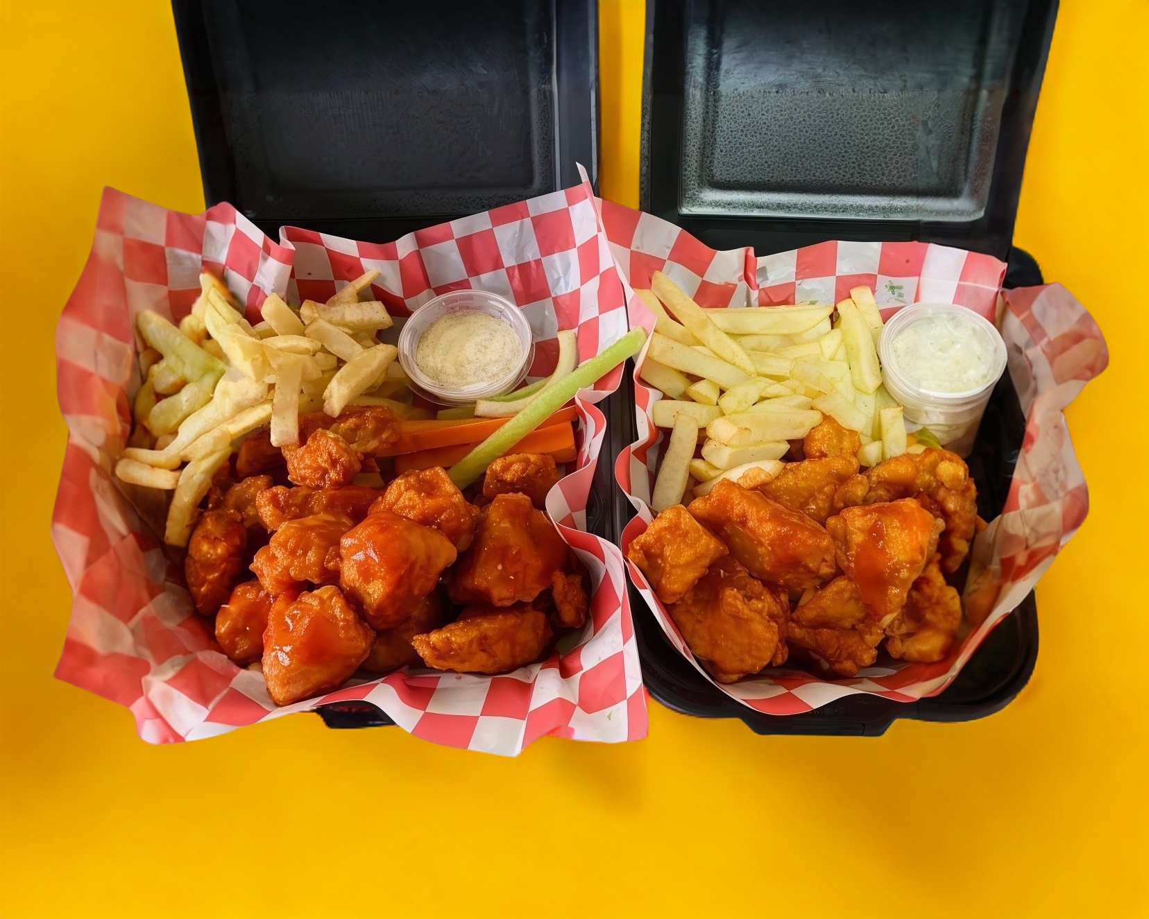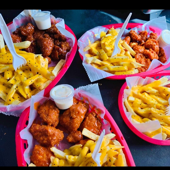 1k de boneless (peso en crudo) bañados en 4 salsas a elegir, 2 porciones papas fritas con queso amarillo, Toping ranch