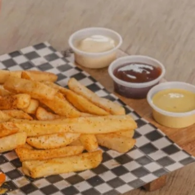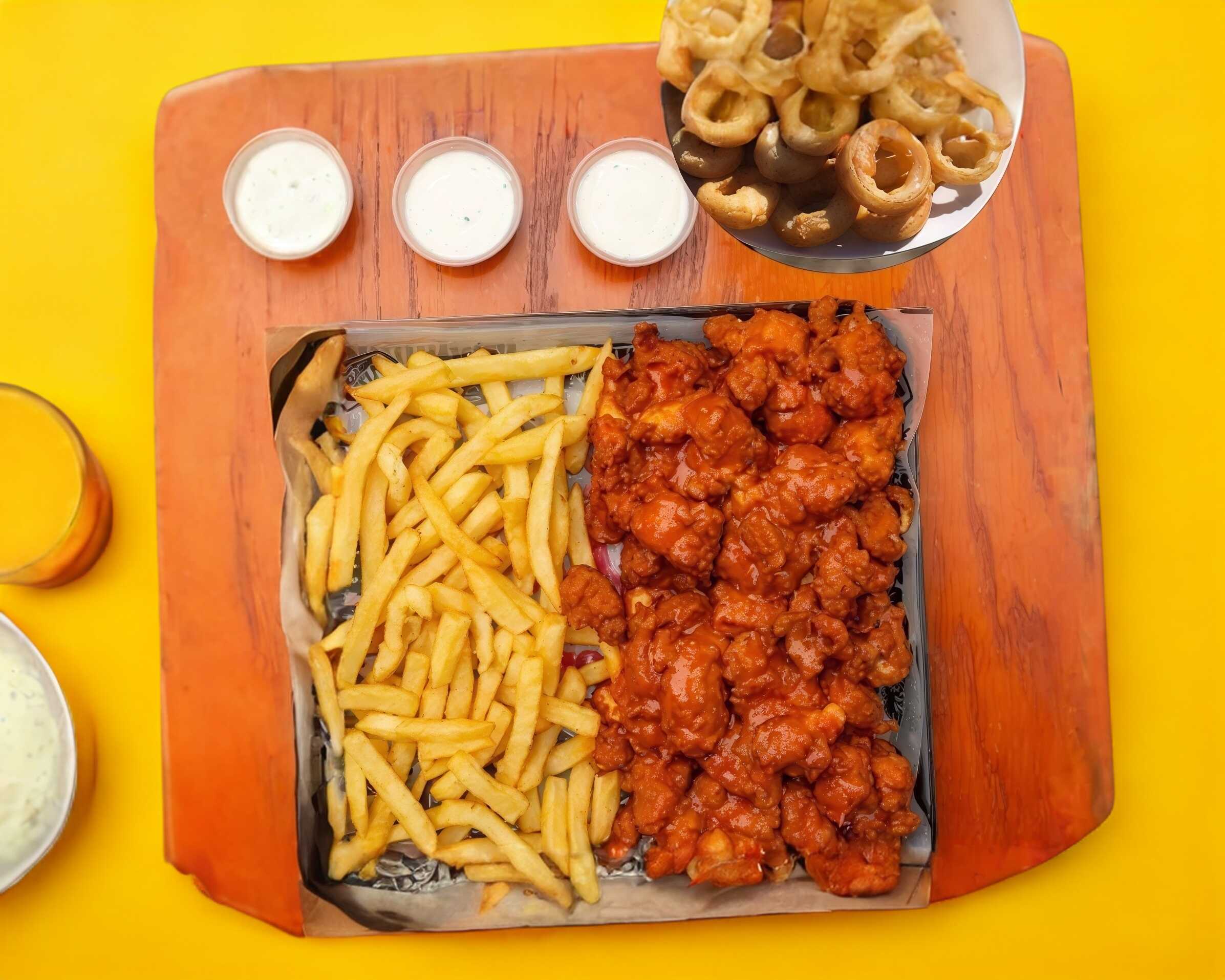 250 g (peso n crudo) de boneless bañados en una deliciosa salsa de tu preferencia acompañados de una porción de papas fritas, 4 aros de cebolla, aderezo ranch y cátsup.