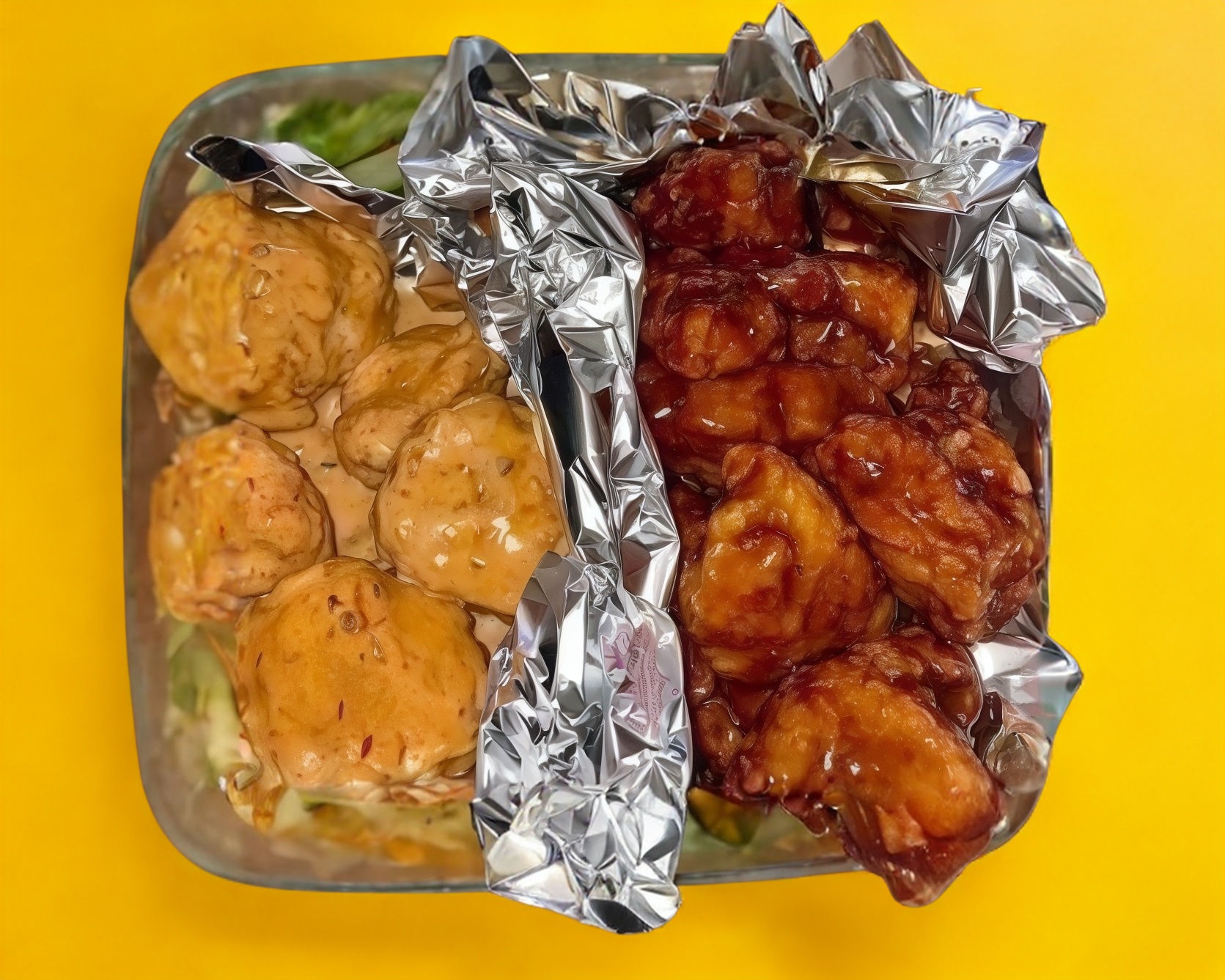 500 g de boneless , (peso en crudo) bañados en dos salsas , acompañado de papás con queso, y topinng rach.