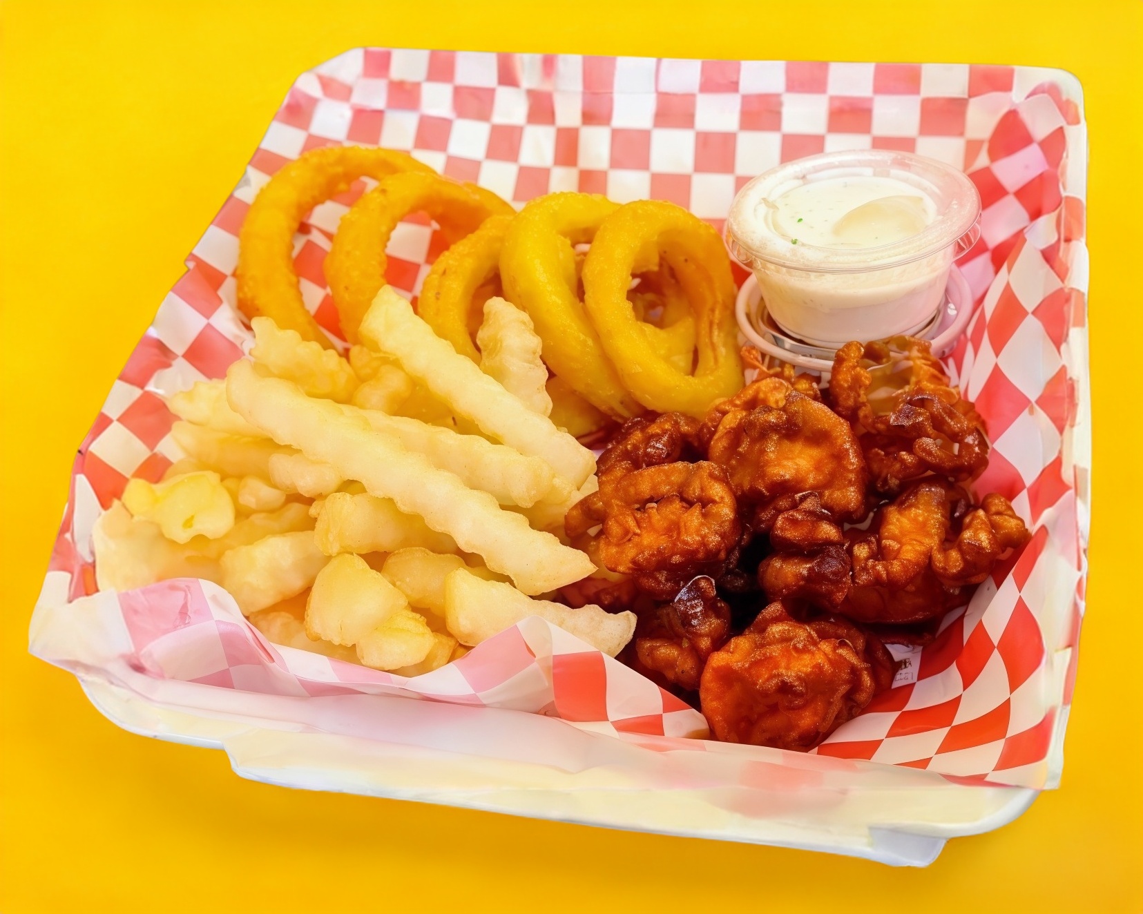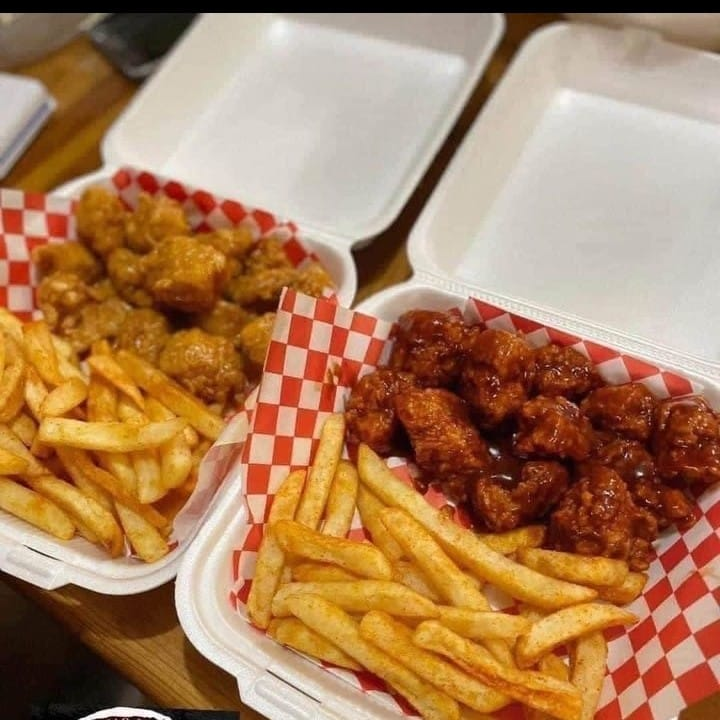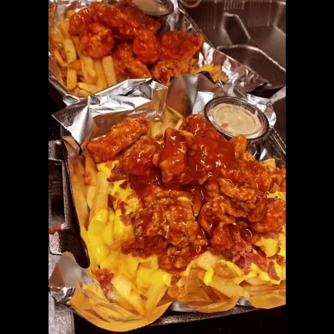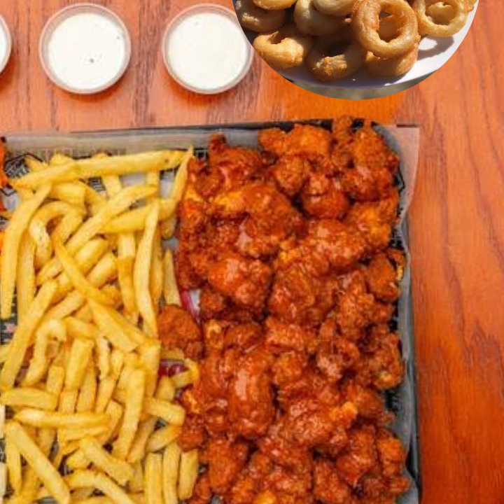 1 k de Boneless(peso en crudo )!bañados en 4 salsas a elegir , 2 porciones de papas fritas,10 aros de cebolla 🧅 toping ranch y catsup.