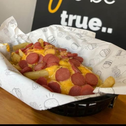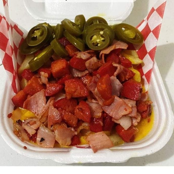 Papas fritas , queso amarillo, tocino, salchicha para asar, chiles curtido.