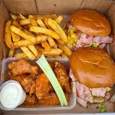 Dos hamburguesas tocino, 250 g de boneless bañados en 1 salsa, porción de papas fritas, topping ranch y catsup