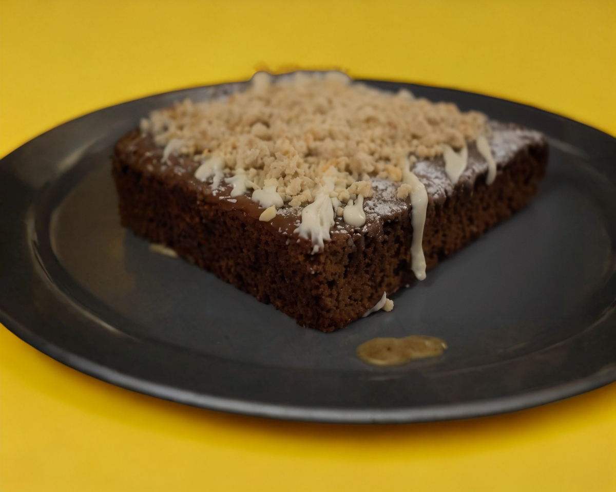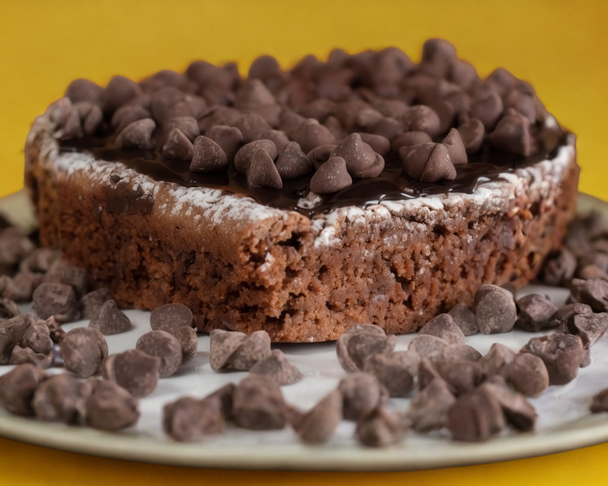 Brownie de chocolate cubierto de ganache y chispas de chocolate