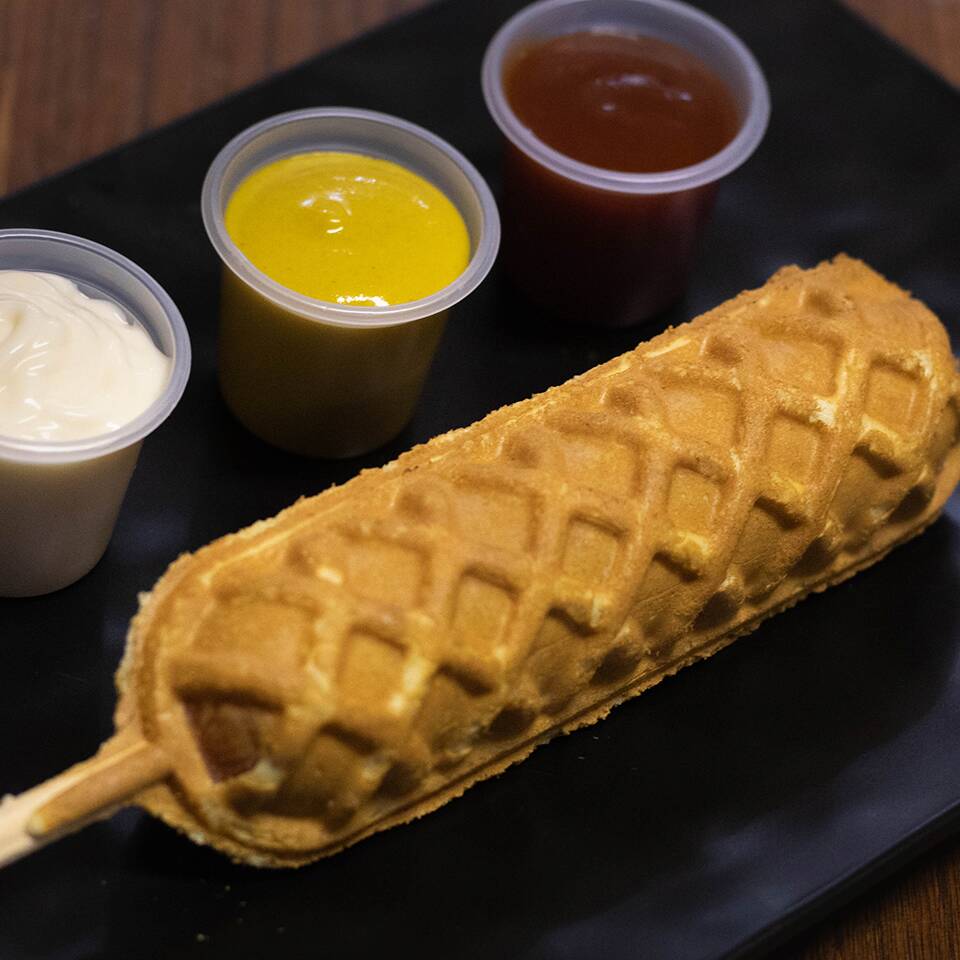 Banderilla recién horneada rellena de salchicha Frankfurt, acompañada de aderezos (Servidos aparte) *No es frita