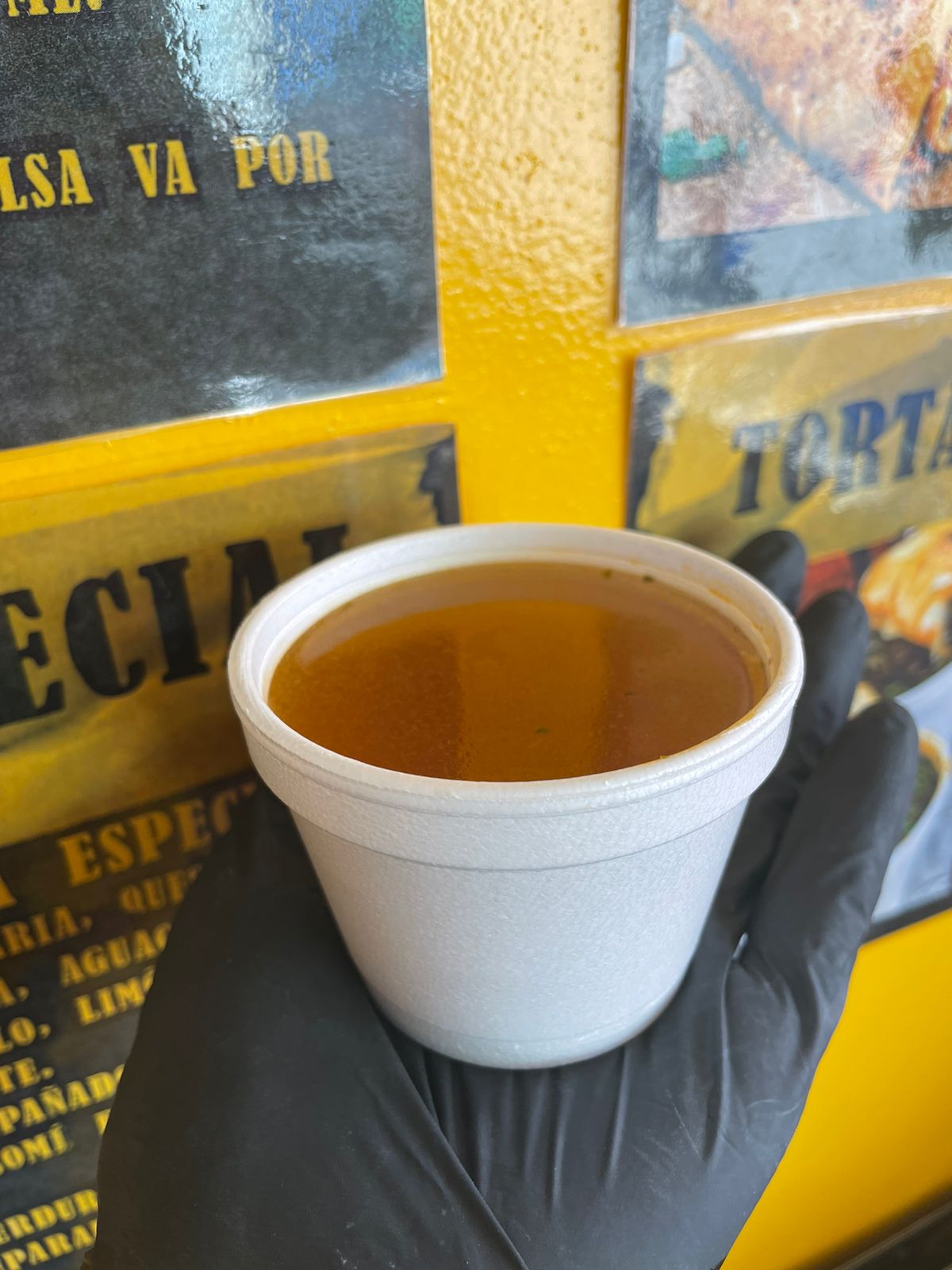Consomé de 500 ml SOLO CALDO. Acompañado de cilantro, repollo, cebolla, limón y salsa. Todas las verduras van por separado
