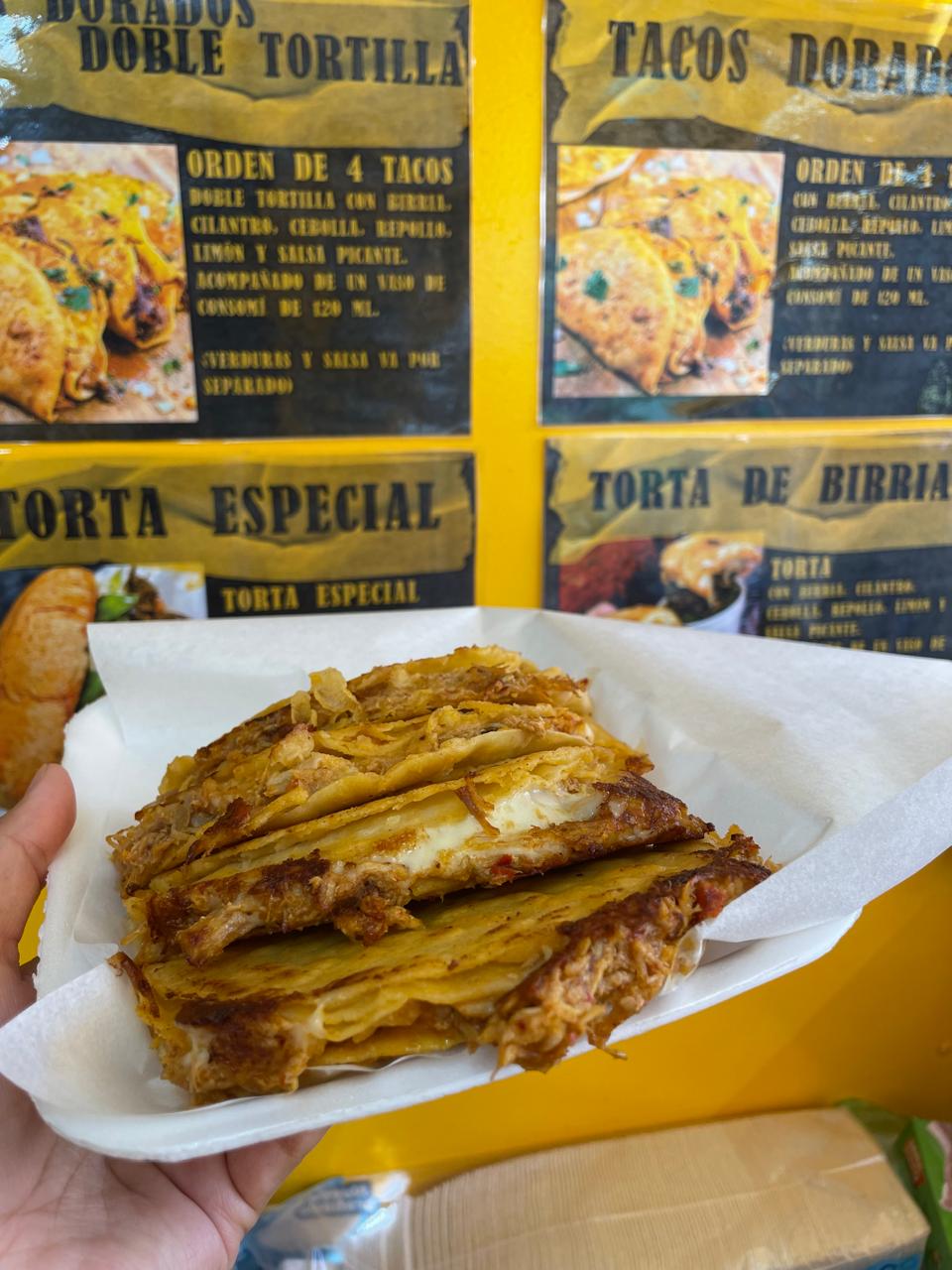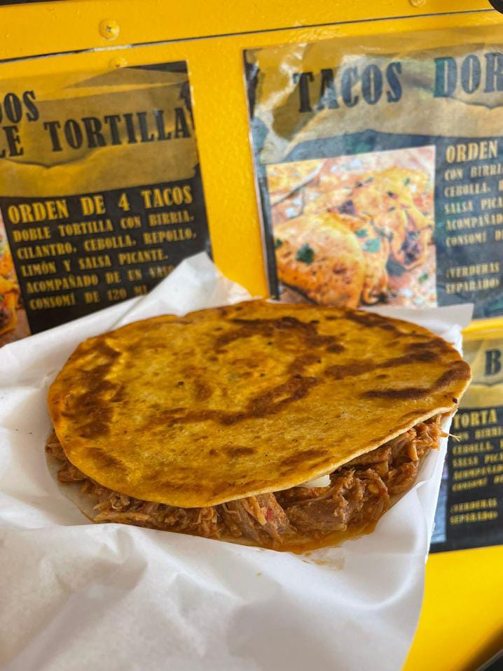 Tortilla de harina con queso, birria, cilantro, cebolla, repollo, salsa picosa al gusto acompañado de un vaso de consomé.