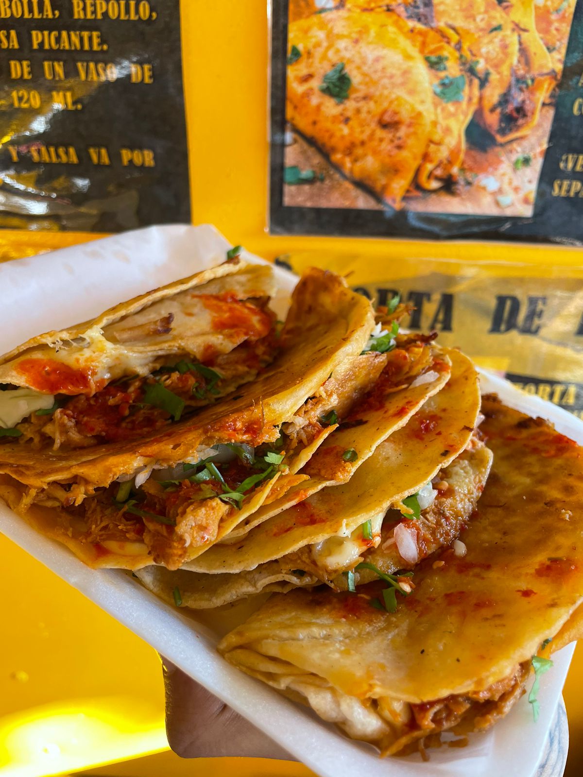 4 Tortillas de maíz dobles con queso, birria, cilantro, cebolla, repollo y salsa picante al gusto acompañado de un vaso de consomé.