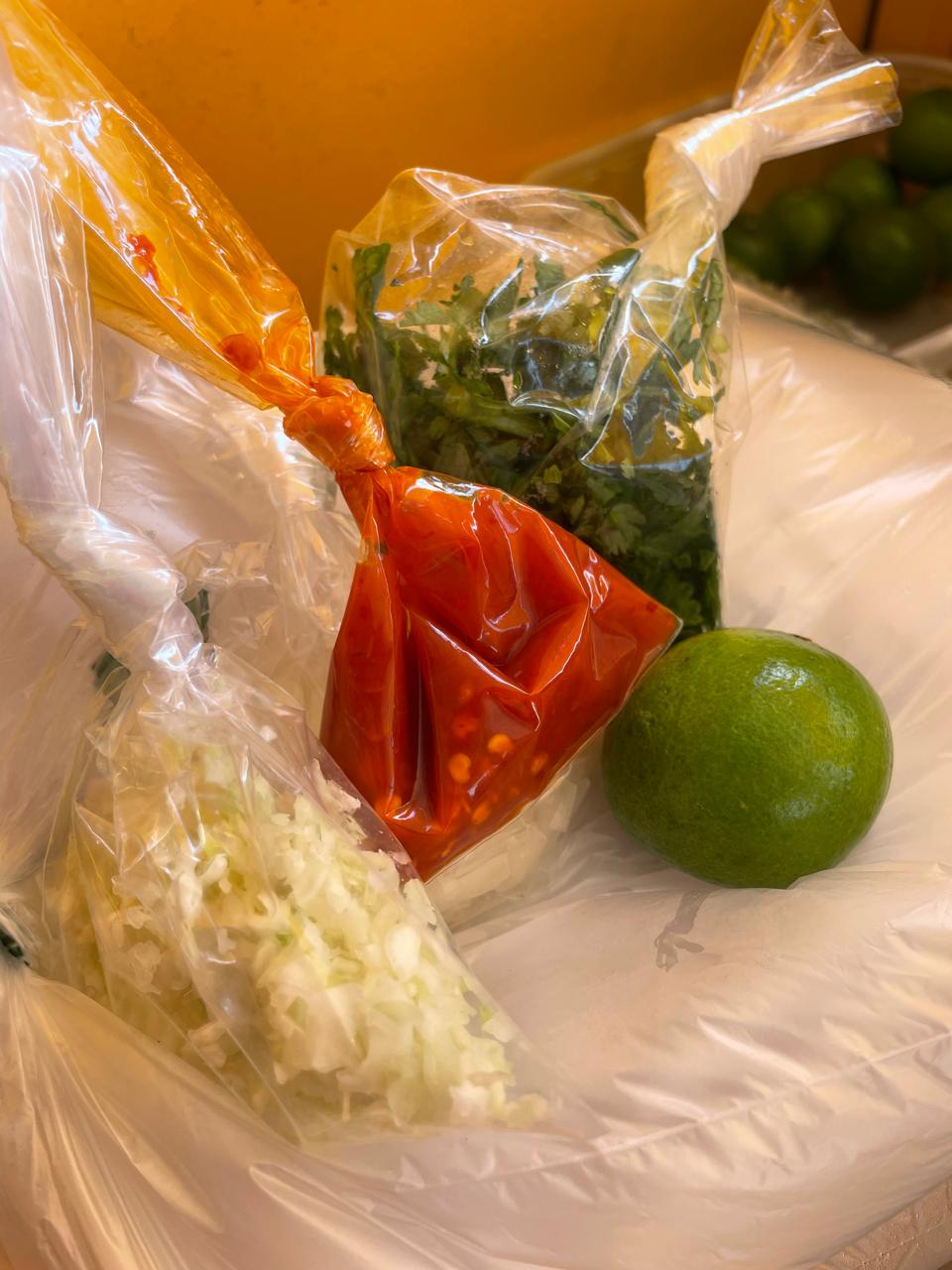 bolsita de cilantro, una de cebolla, una de repollo, una de limón y una de salsa
