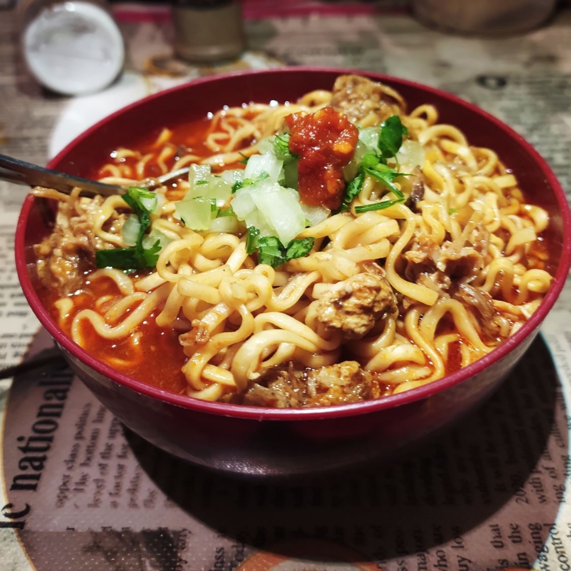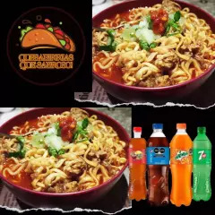 Aprox. 500 ml. sopa Ramen con birria, cilantro, cebolla, limón, repollo y Salsa picante al gusto.