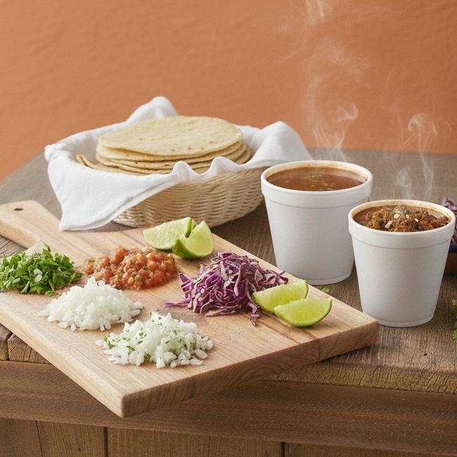 Delicioso consome de birria con carne, 8 tortillas de maiz, verduras (repollo. cebolla, limon, cilantro y salsa de arbol)