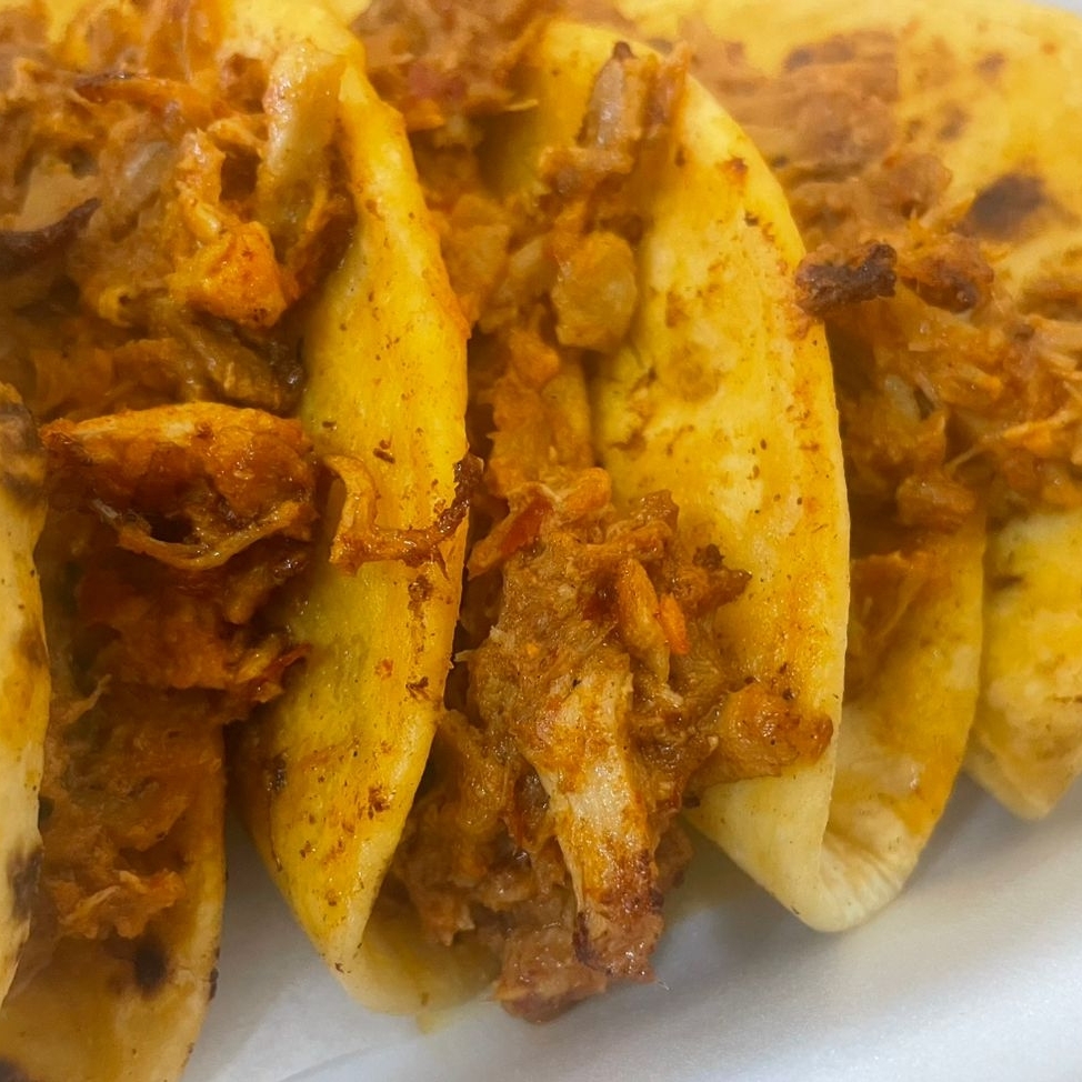 4 Tacos de maíz sin dorar, acompañado de un consomé de 118 ml. y bolsitas de verdura, repollo, cilantro, cebolla, limón y salsa de árbol.
