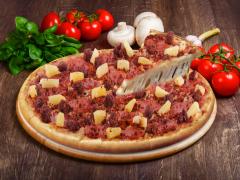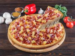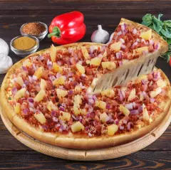Pizza familiar de Adobada, Tocino, Cebolla y Doble Piña en masa italiana