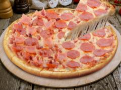 Pizza mitad pepperoni y mitad suprema, tocino, jamón