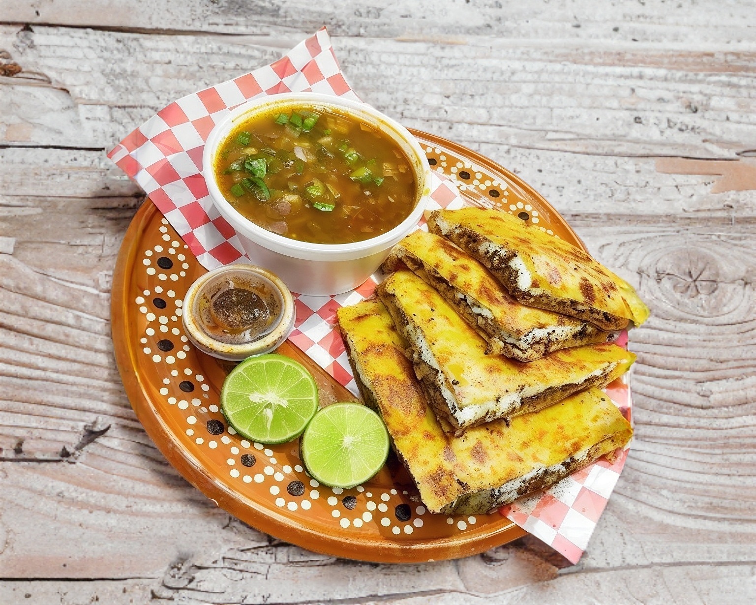 4 quesibirrias de maíz con consomé salsa cebolla cilantro y limón