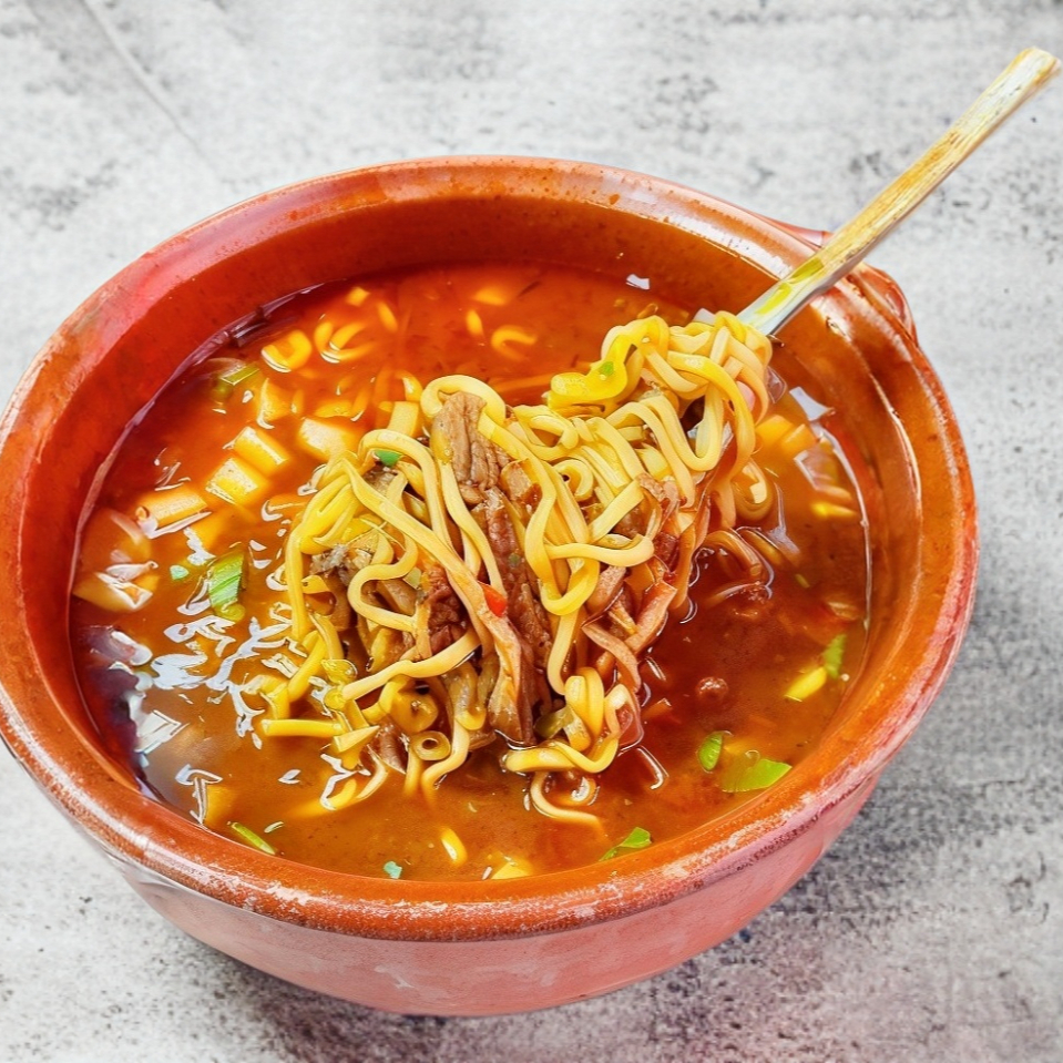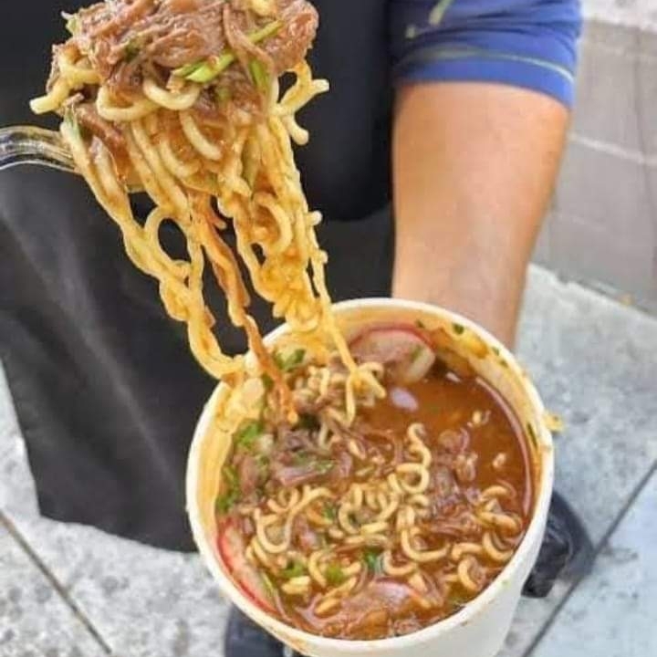 aprox 1 litro de ramen con birria cilantro cebolla y salsa