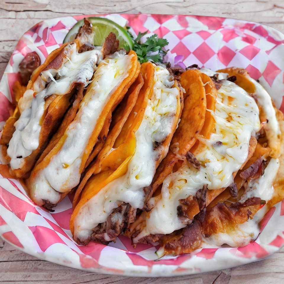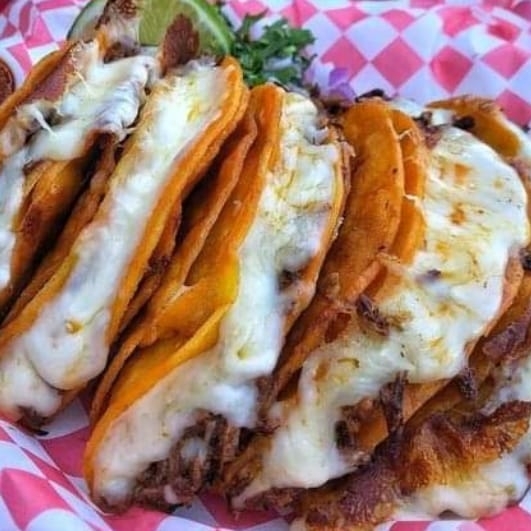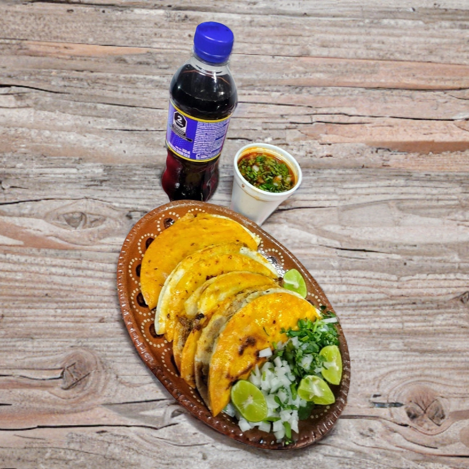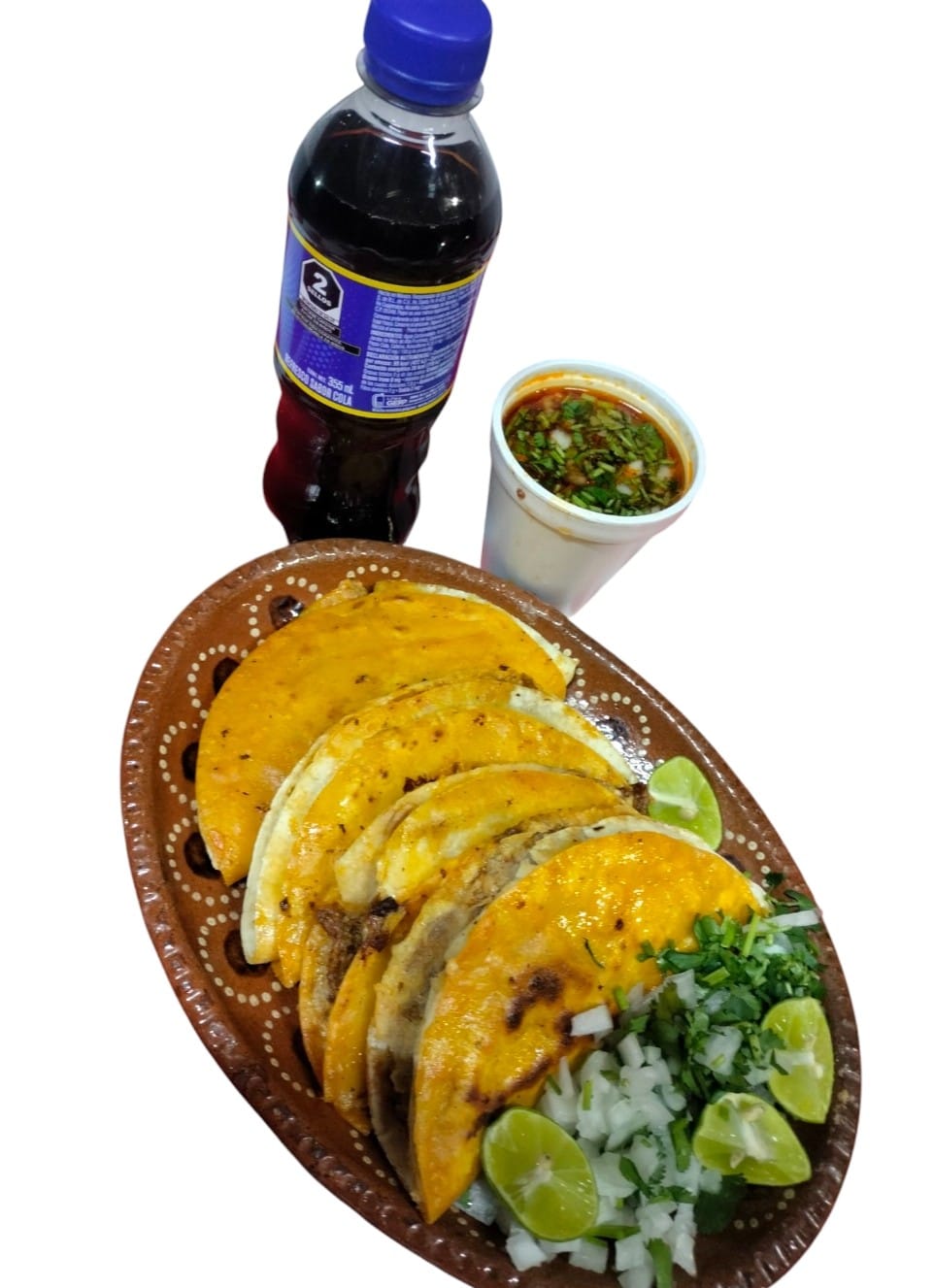 4pz doble tortilla birria queso cilantro cebolla salsa y limón