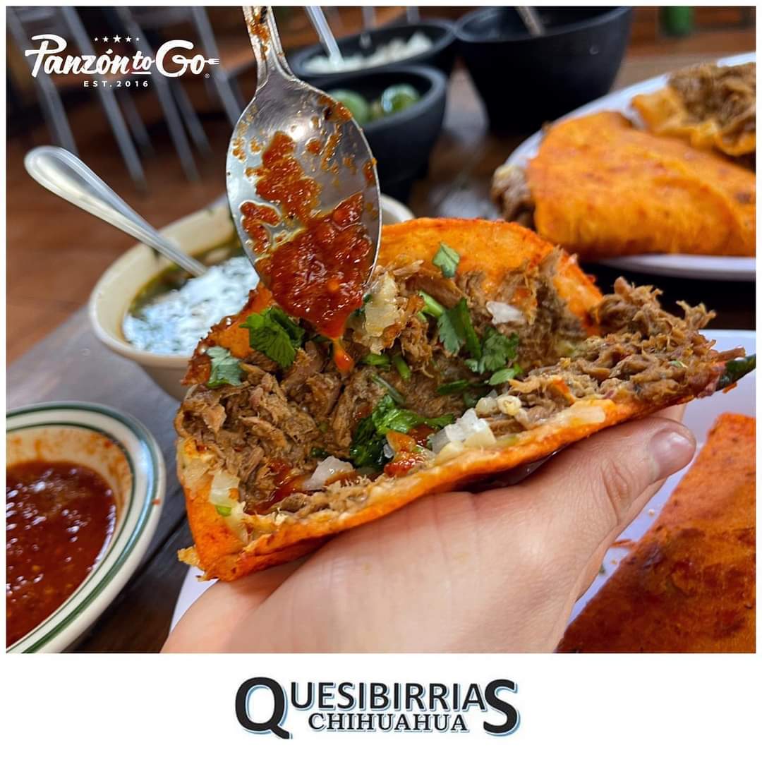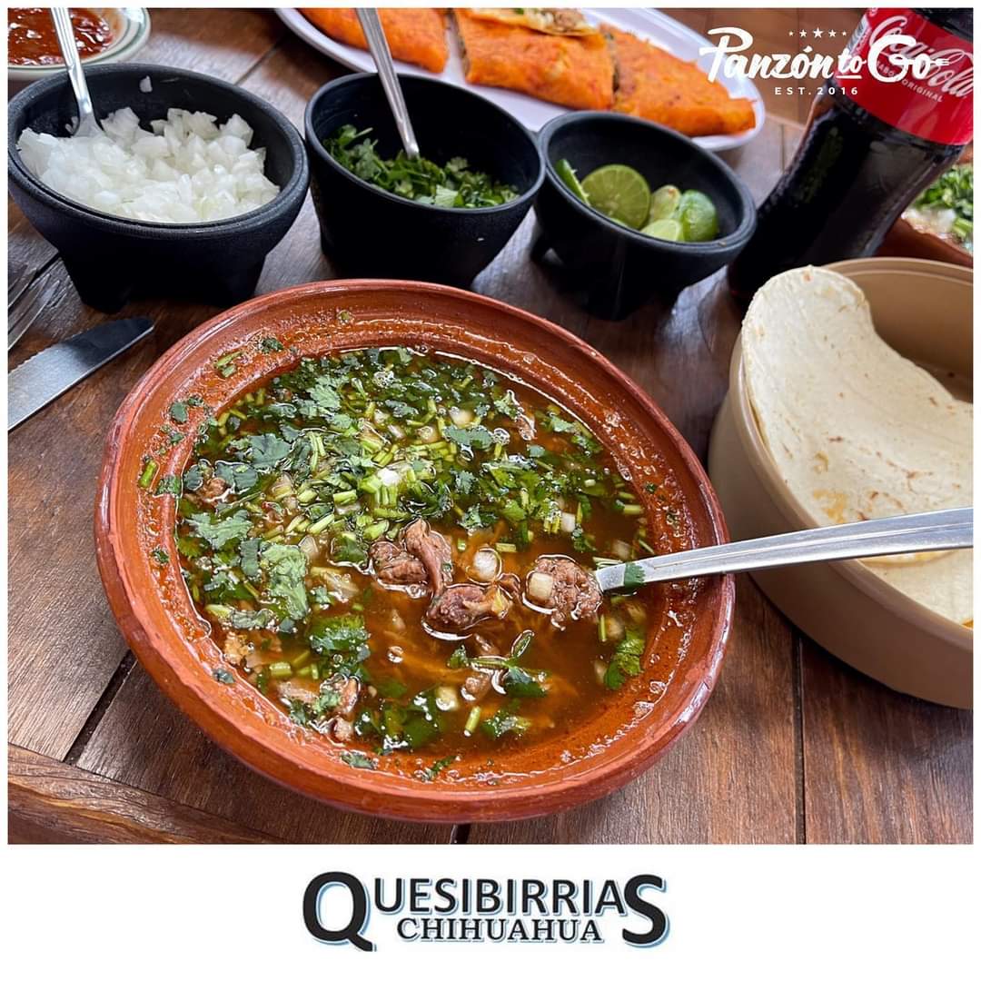 Quesadilla de tortilla de maíz doble (2 piezas), doraba sobre la plancha, bañada con consome de birria, montada en su interior con deliciosa birria, cebolla y cilantro, acompañado de un consomé de 355 ml.