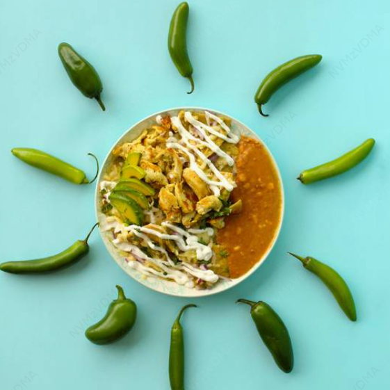 Deliciosos chilaquiles bañados en una salsa a elegir, con queso, cilantro, cebolla, y crema. Incluye una porción aparte de frijolitos con elote.