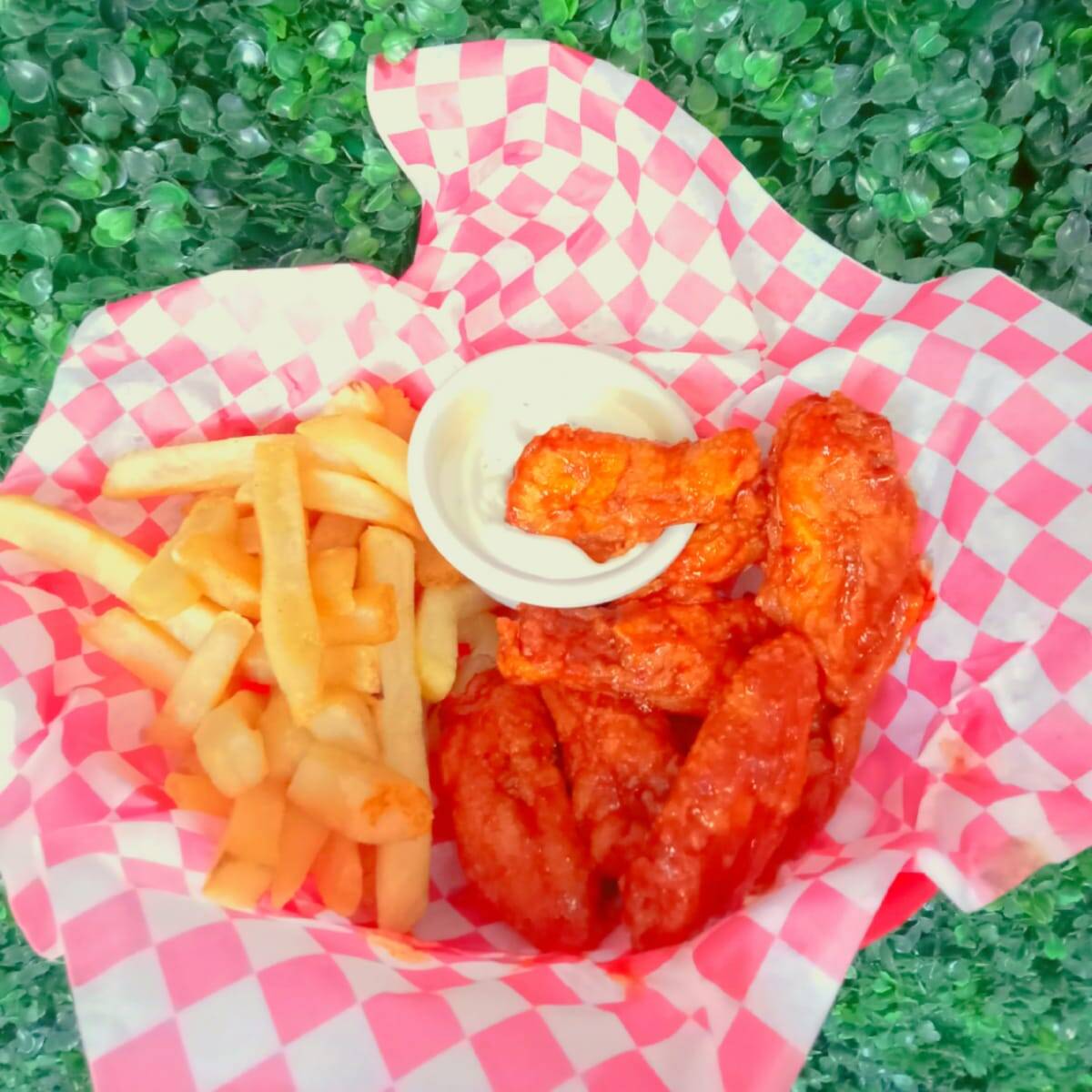 Deliciosas Alitas grandes de pollo bañadas en la salsa de tu elección, acompañadas de papas fritas y porción de aderezo Ranch