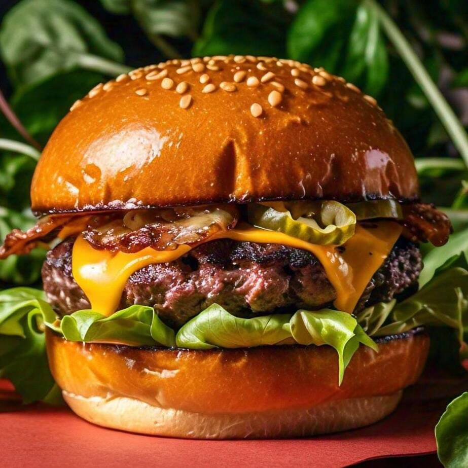 Deliciosa Hamburguesa con carne de Sirloin acompañada de queso Americano y Tiras de Tocino. Acompañada de sus deliciosas Papas Fritas
